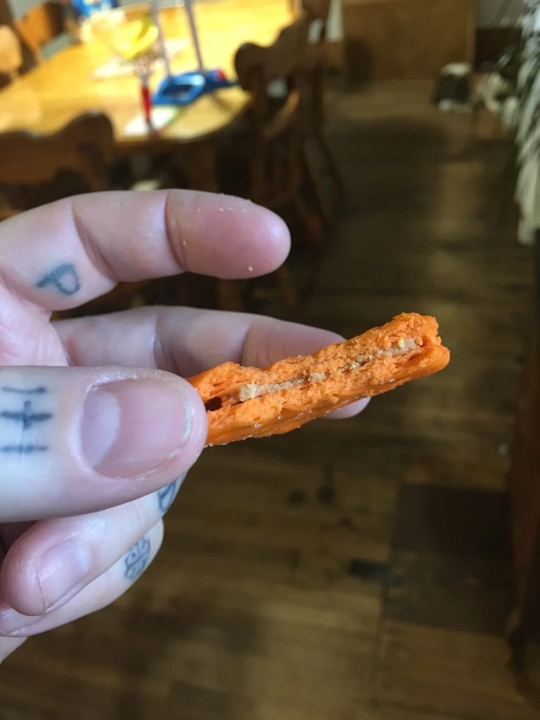 Ce qui surprend dans la première bouchée, c’est la croustillance du biscuit. Très raide sur les prémolaires du bas. Ensuite vient immédiatement et sans aucune hésitation le goût du beurre de peanut. Très réussi. J’ai aucune misère à croire que c’est bien du « real » beurre de peanut. Si je pouvais prendre un guess, je dirais que le goût se rapproche drôlement du beurre d’arachide Peter Pan, pour les connaisseurs. De niche.