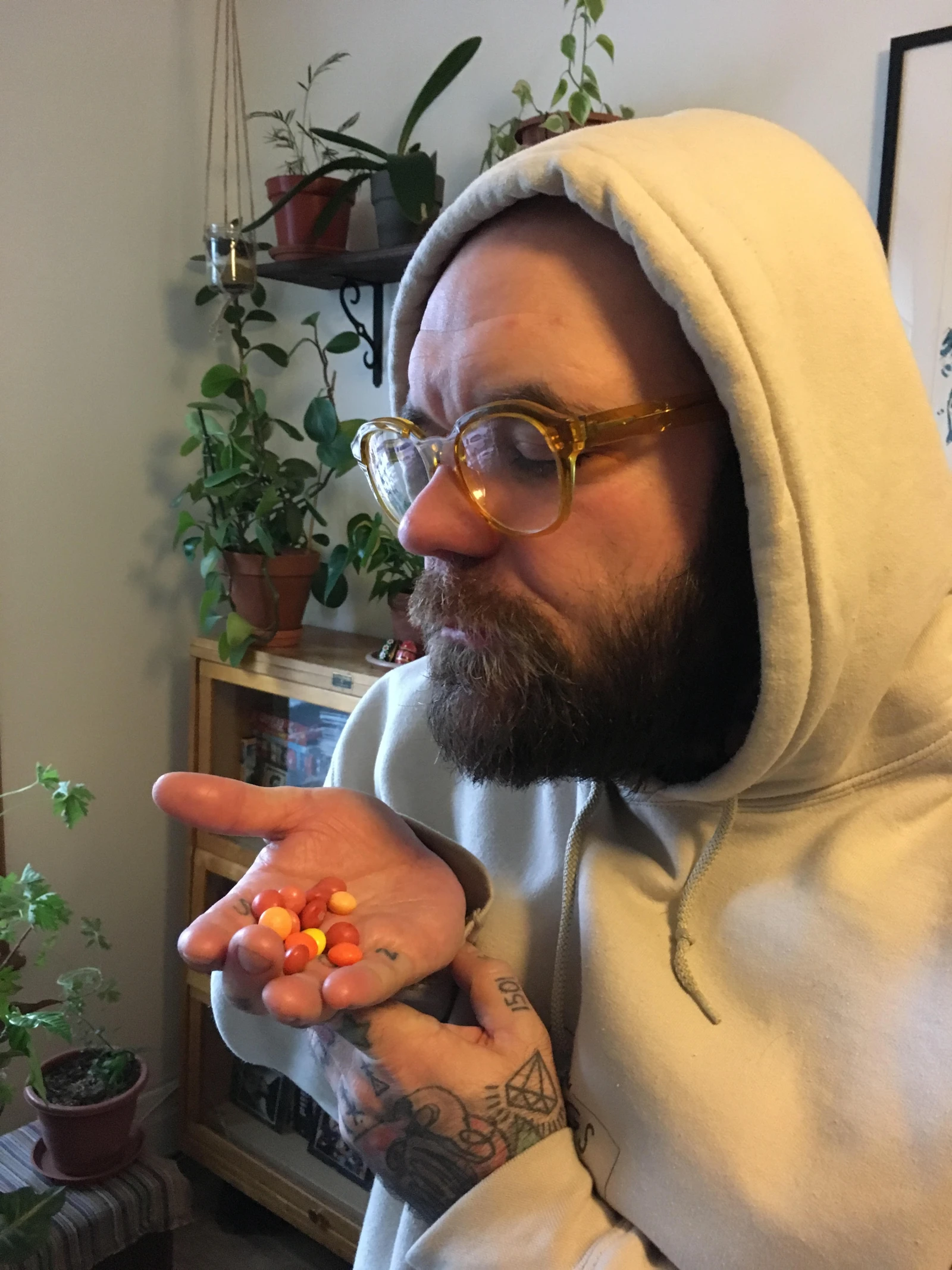 J’ai un respect infini pour ces friandises et surtout pour leur marketing récent, qui fait croire en la magie et donne le goût de transformer ses parents, ses amis, son patron, sa table de chevet et toutes les autres affaires qui font chier de temps en temps en Skittles. Par contre, je dois dire que jamais de ma vie j’en ai acheté. J’en vole à mes enfants dans leur citrouille d’Halloween, j’en ai à l’occasion dans ma loge quand les promoteurs ne connaissent pas l’existence des jujubes et des fois y’a un guignol qui en a et qui m’en déverse dans le creux de ma main que j’utilise en guise de bol pour recevoir ma portion/potion quotidienne de fruits.