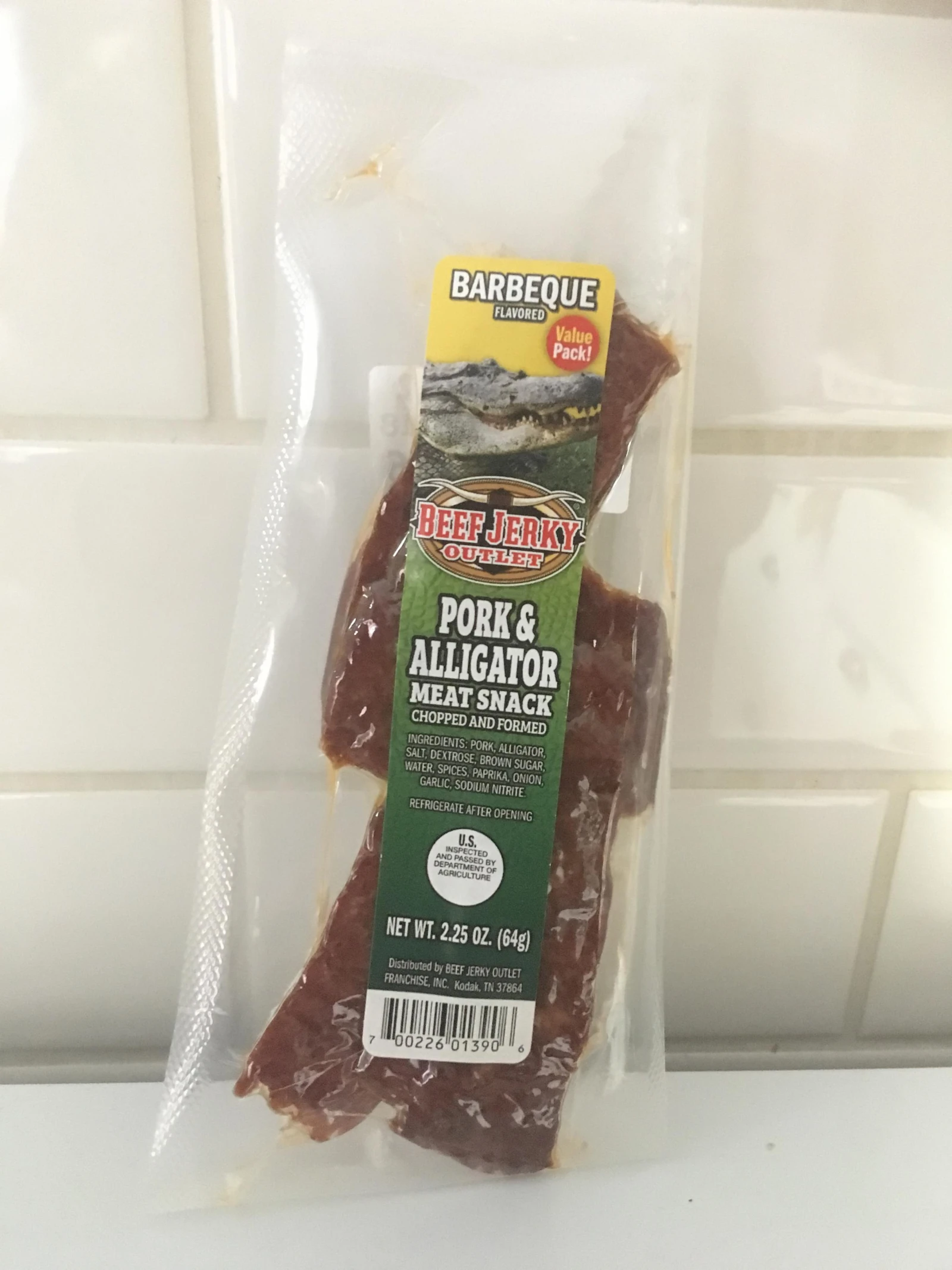 Cette semaine il s’attaque à du beef jerky de porc et d’alligator BBQ, de la marque Beef Jerky Outlet.