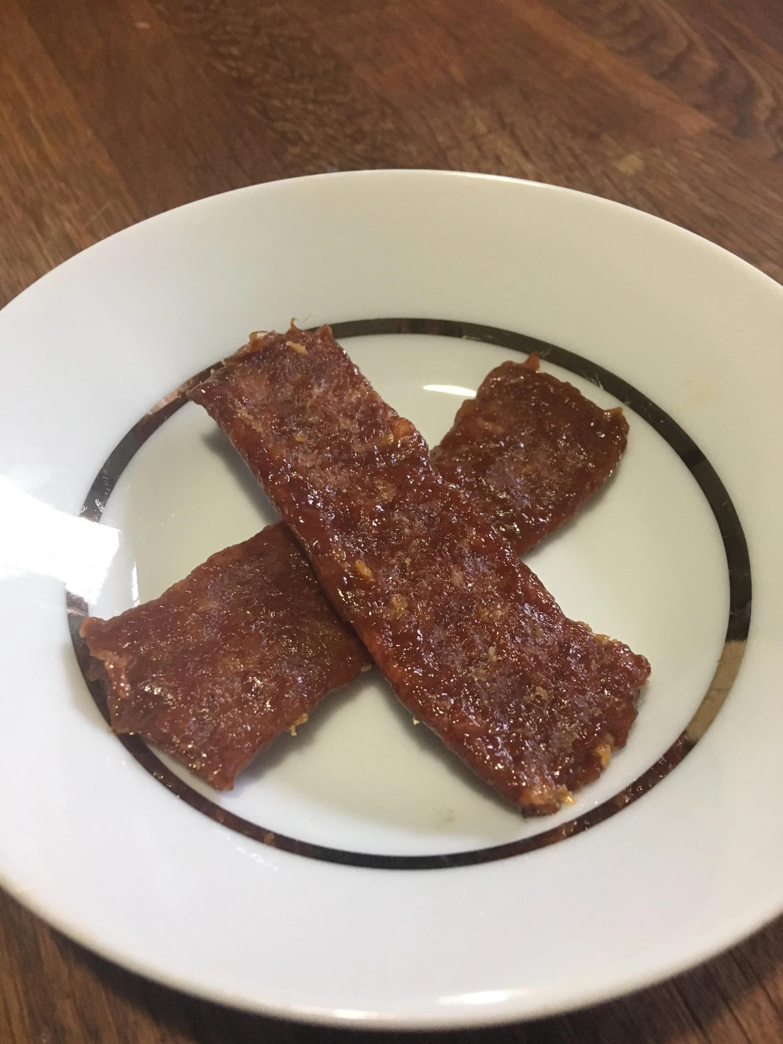 Ce qui m’a le plus manqué durant ces années post-carnivores n’est ni le poulet, ni le smoked meat, ni le fucking bacon. Non, je dirais que le beef jerky ( et la paix de ne pas répondre aux questions « mange tu des œufs? » « Aimes-tu la luzerne? » « tu les pognes où tes protéines? » « criss es-tu fif? » et autres bêtises de l’inconfort humain face au végétarisme ) est mon plus grand manque.