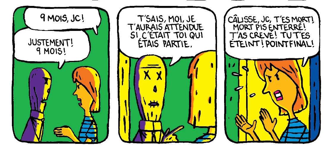 Et puis ? Est-ce que le pays a sombré dans le vice et le stupre depuis la légalisation ? À part les effluves plus assumés et les magasins d’accessoires de tous acabits, rien n’a changé. Nous sommes toujours aussi… nous ? Au moins, quand on est gelé on se sent léger. En anglais on dit high ou inversement stoned. On devient lisse, dur et froid comme la roche d’une pierre tombale. Comme celle que touche le personnage principal de la BD de Blonk, 23 h 72… en sortant de son cercueil.