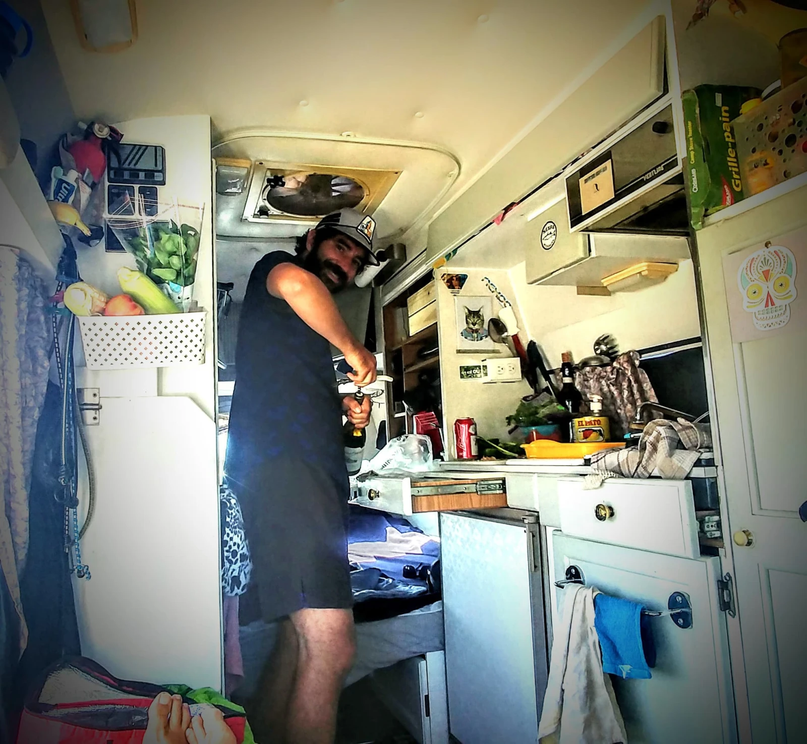 Arborant fièrement le kit du yéti trucker, il a pris une pause d’ail pour ouvrir le blanc❤. L’état du truck? Bordélique? Je ne le remarque plus. Bienvenue dans la vanlife.