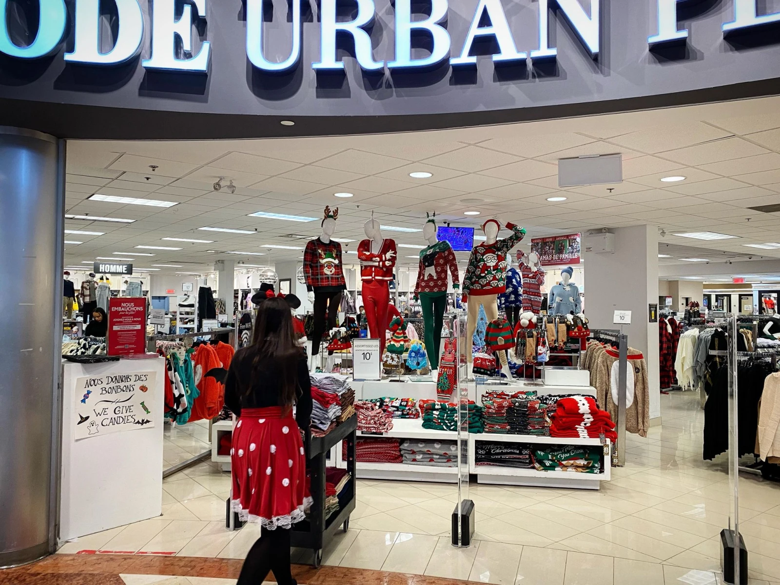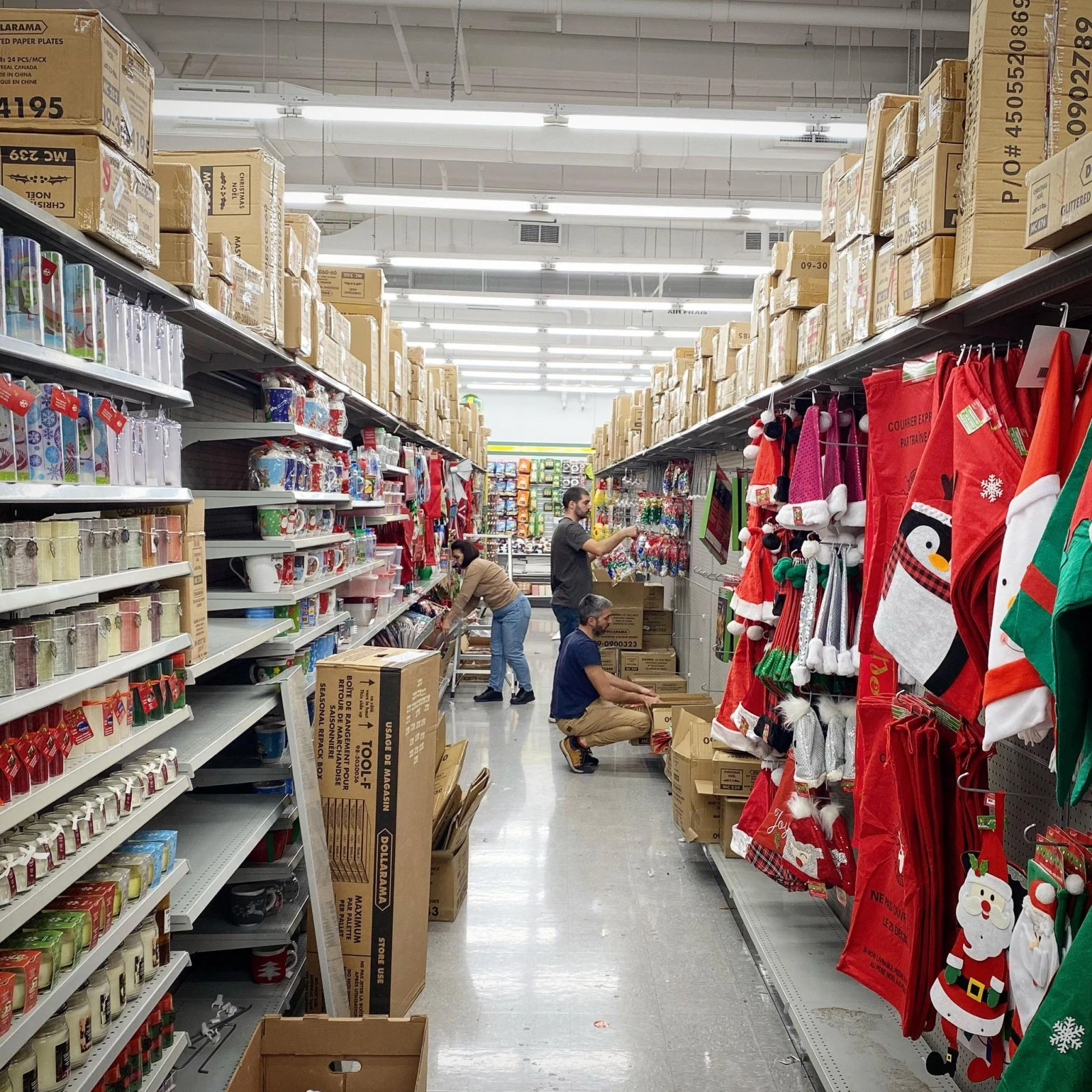 Premier arrêt au Dollorama près du bureau, dans Griffintown, où des employé.e.s s’affairent justement à aménager la section Noël.