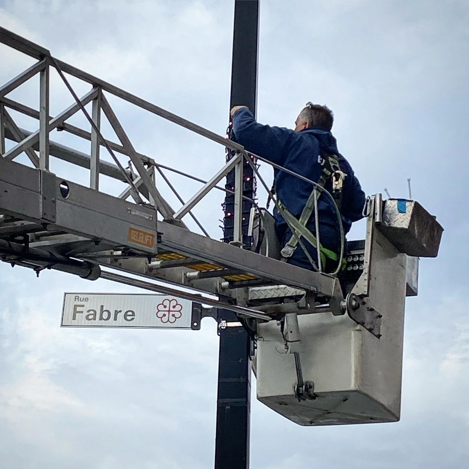 En retournant vers ma voiture, je croise au coin Fabre un monsieur juché dans une nacelle en train de poser les lumières de Noël sur un lampadaire de l’avenue commerciale.