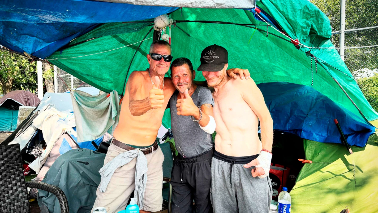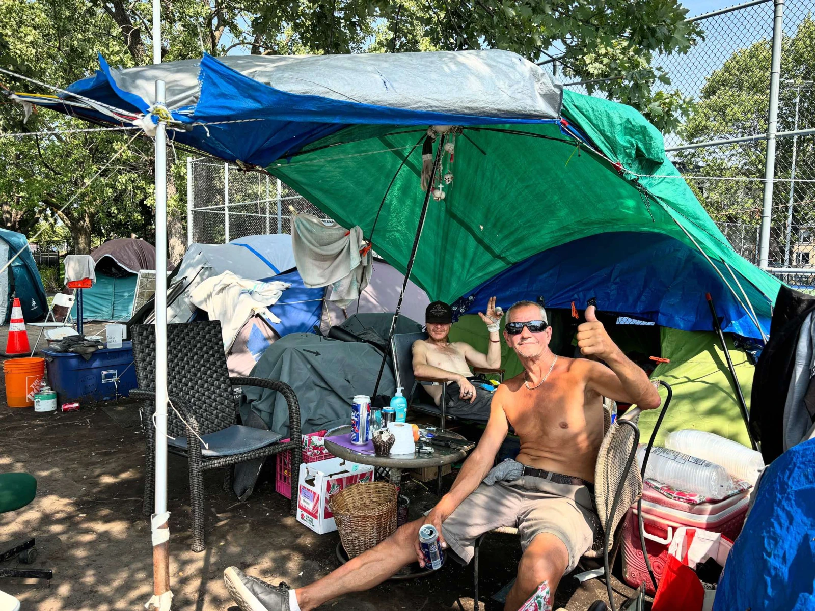 « On résiste! », laisse tomber Serge, 59 ans, en train de boire une Pabst à l’ombre d’une bâche, devant la tente où il dort depuis novembre. Le Longueuillois de 59 ans raconte s’être retrouvé à la rue il y a deux ans, après l’incendie de son logement. « C’est facile de tomber dans la rue, mais dur d’en sortir », confie le gaillard bronzé.