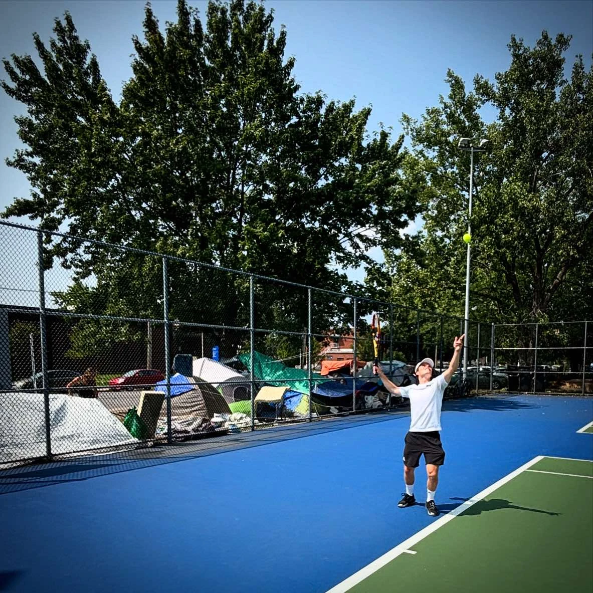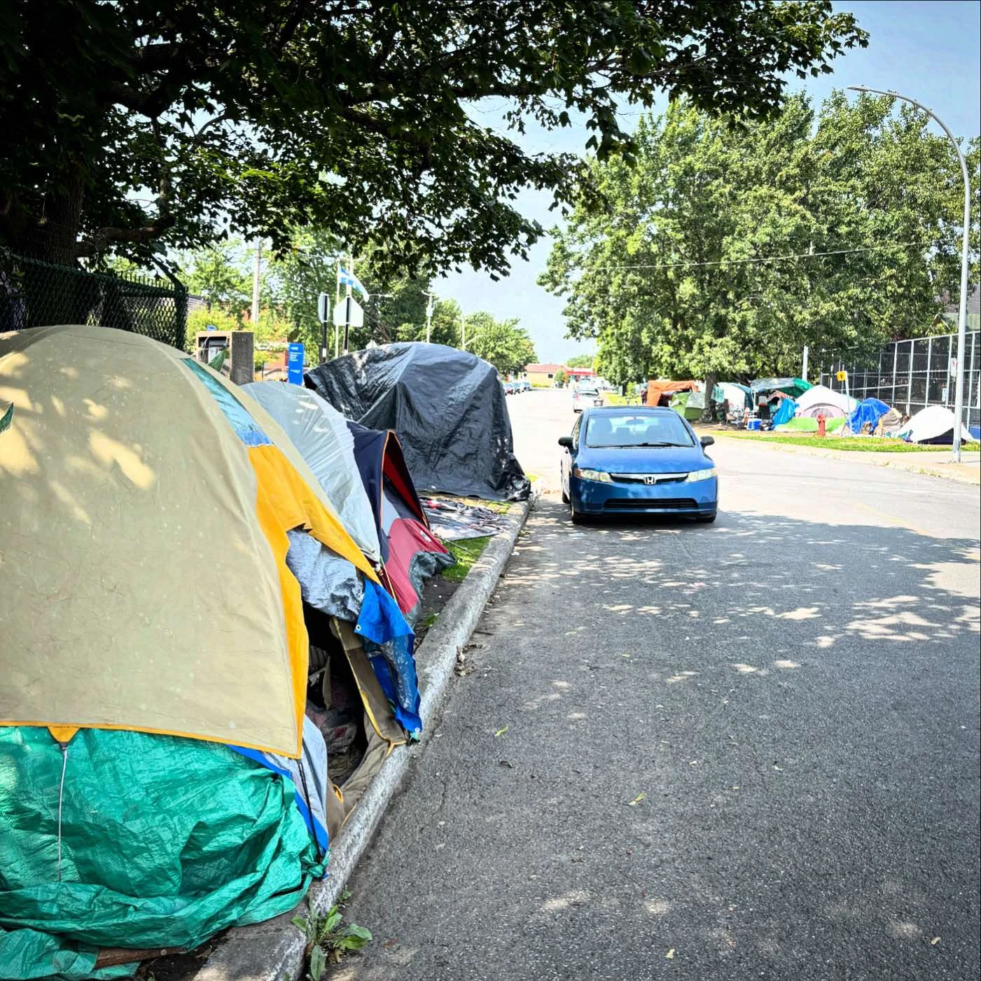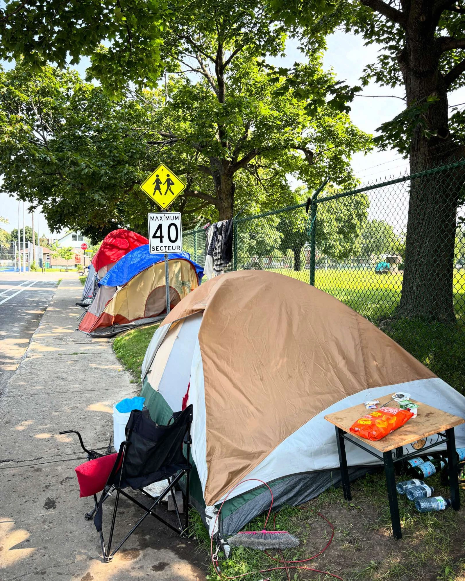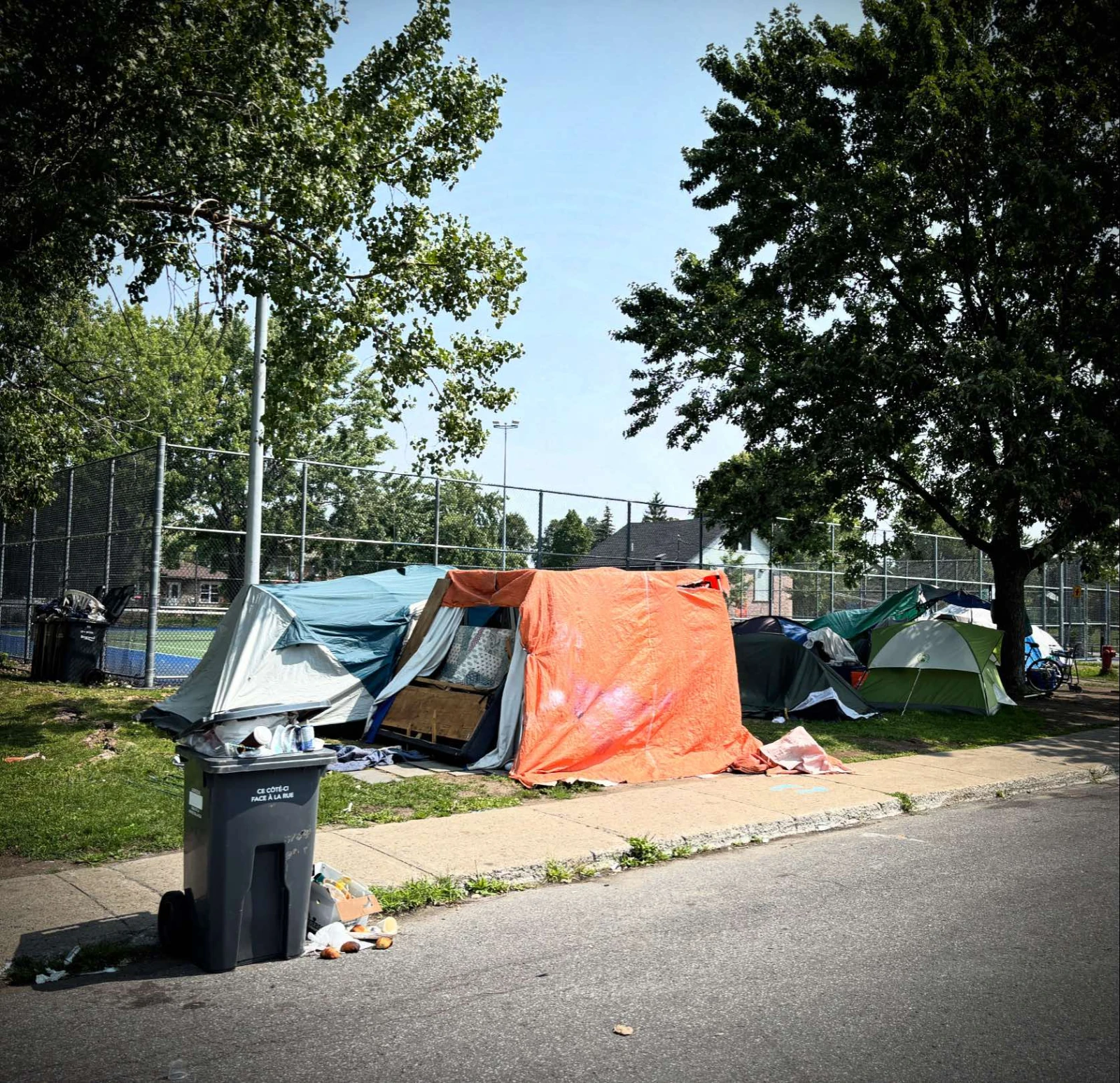 Un peu plus loin, Marie-France accepte de me raconter un peu les désagréments liés à ce voisinage inusité, dont quelques tentes se trouvent juste en face, de l’autre côté de la rue. « On a eu un itinérant dans notre cour, l’autre jour. Le problème, c’est qu’il a laissé la porte ouverte en sortant et j’ai de jeunes enfants… », souligne la mère de famille, en me pointant la rue passante devant sa maison. « Plusieurs voisins se sont fait voler, mais il n’y a que des jouets d’enfants dans notre cour », se console Marie-France, qui refuse toutefois de condamner les campeurs. « Le jour où ça ne sera plus mon problème, ça sera celui de quelqu’un d’autre. Il faut leur trouver une place pour rester », affirme la maman avec empathie, qui déplore toutefois de ne pas pouvoir envoyer ses enfants profiter du parc rénové. « Aucun parent ne veut envoyer ses enfants jouer là-bas. L’an dernier, l’école primaire assurait le transport scolaire aux élèves, même à distance de marche… »