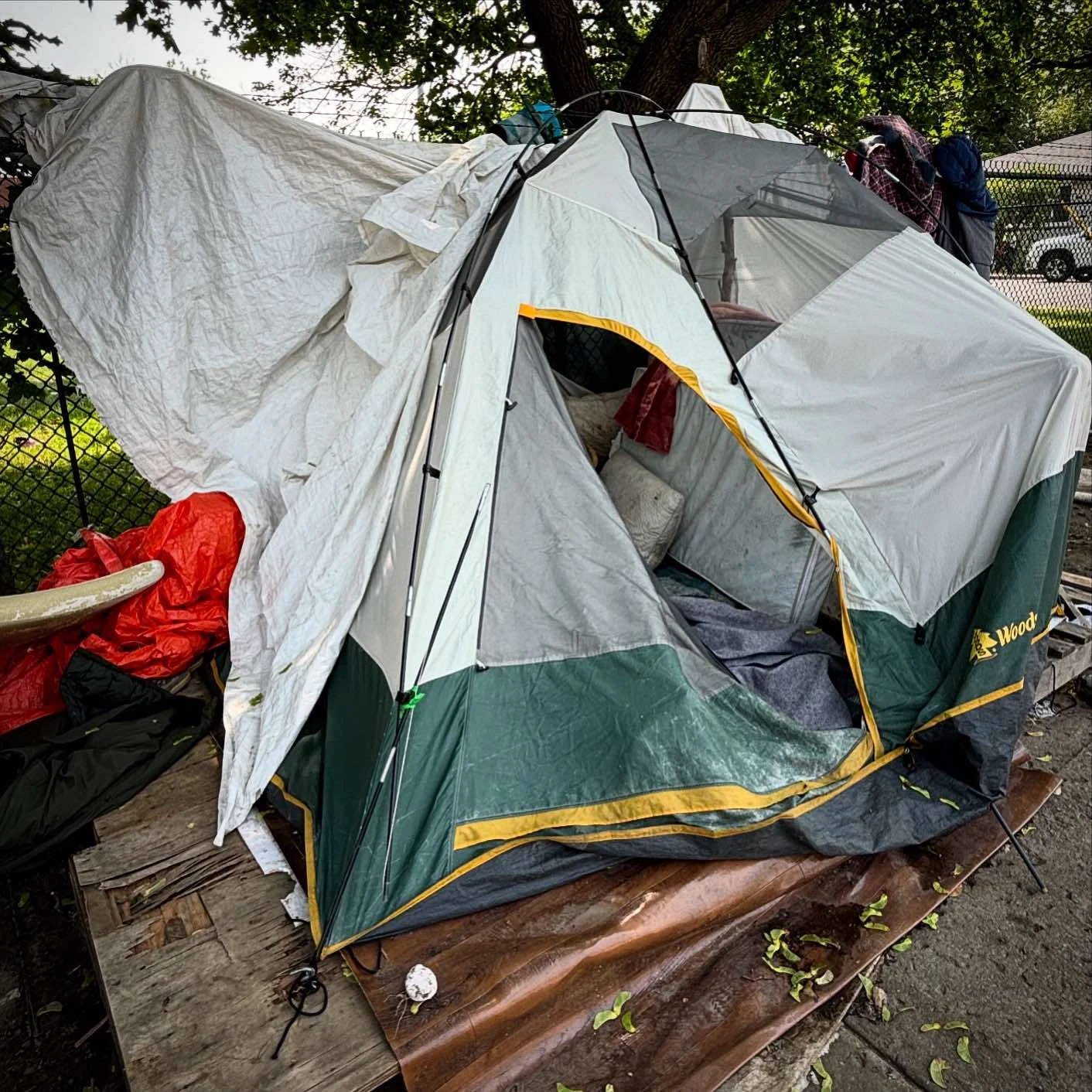 Une femme en train de passer le balai devant son espace jonché de déchets éclate en sanglots lorsque je lui demande comment ça va, vu les circonstances. Par-dessus l’engueulade qui a toujours cours dans une tente voisine, elle se lance dans le récit d’une vie triste à mourir impliquant des abus de toutes sortes et plusieurs tentatives pour en finir. Elle dit avoir appelé la police ce matin, parce qu’une femme du campement a monté tout le monde contre elle et menace de la tuer. « C’est certainement pas parce que je crois en la justice, mais c’est parce que j’ai trois enfants et deux petits-enfants. Personne ici ne va les contacter s’il m’arrive quelque chose… »