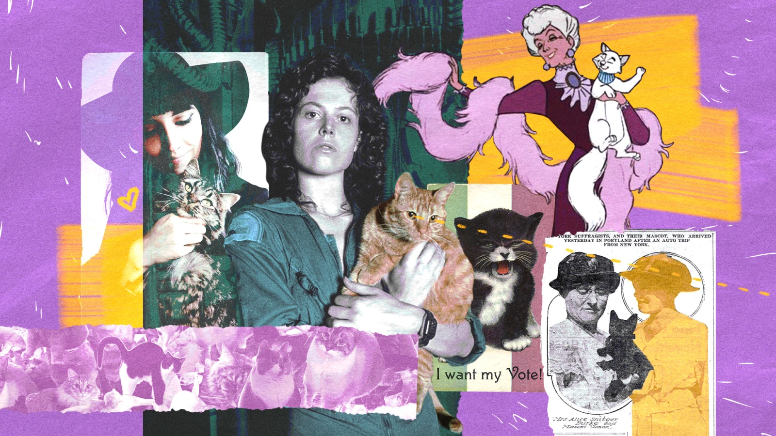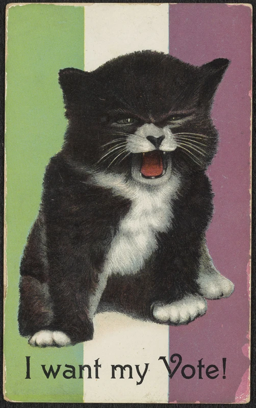 « Oui, mais c’est quoi le rapport avec les chats? », vous demandez-vous sans doute, excédé par ma volonté que mon bac en littérature serve enfin à quelque chose. Eh bien, c’est à la fin du 19e et au début du 20e siècle que l’union entre les chats et les femmes faisant de l’excès de zèle en termes d’indépendance et de désir d’émancipation sera officialisée grâce au mouvement des suffragettes. Dans un premier temps, le chat était utilisé comme figure de remplacement pour ces maudites femmes gossantes militant pour le droit de voter. Dans des caricatures publiées dans divers médias anglais et américains, on pouvait voir des chats miauler pour exiger le droit de vote, comparant ainsi la voix des femmes aux miaulements stridents du félin. Comme quoi ça ne date aussi pas d’hier qu’on critique les femmes sur leur voix.