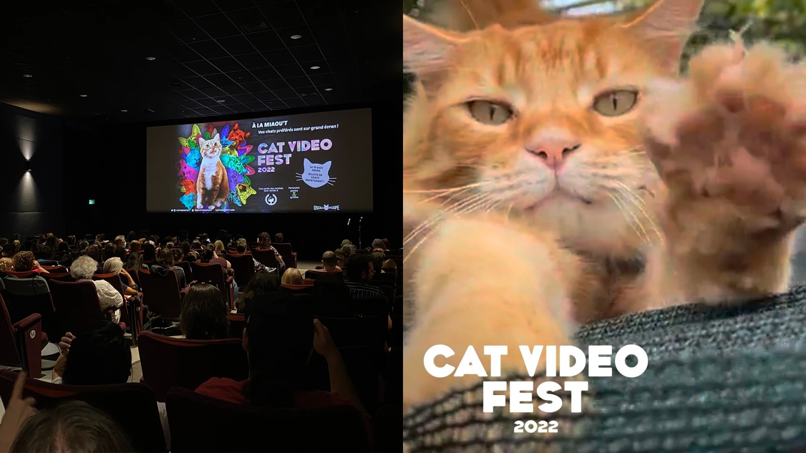 Ma première action pour redonner aux chats leurs lettres de noblesse fut donc d’assister au CatVideoFest, un festival qui présente chaque année une sélection des meilleures vidéos de chats dans près de 200 villes en Amérique du Nord, dont Montréal. Après une édition qui avait affiché complet dans la métropole en 2019, puis deux années d’annulation covidienne, l’événement s’arrêtait lundi soir dernier (à la mi-août… miaou… la comprenez-vous?) au Cinéma du Parc pour une projection de 75 minutes de vidéos félines.