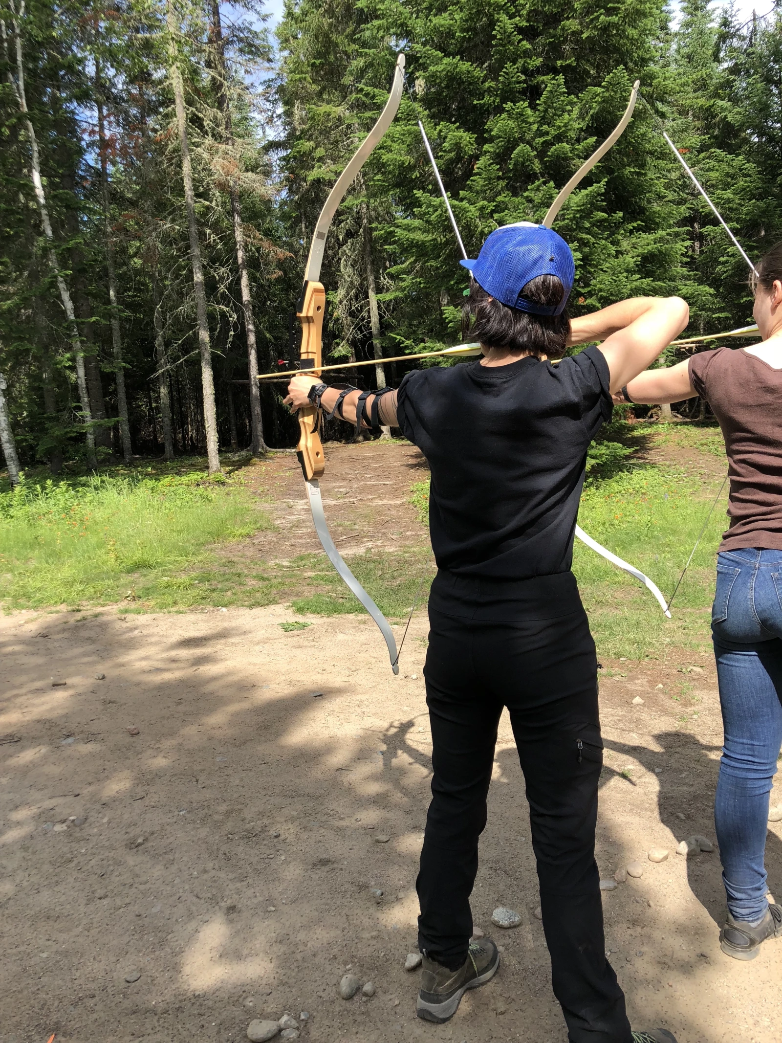 Trois heures. J’ai passé trois heures dans notre embarcation sans pêcher le moindre poisson, lançant et relançant ma ligne à l’eau sans relâche. Comme le veut le cliché, j’ai aussi failli crever un oeil à une de mes coéquipières de bateau quand j’ai perdu le contrôle de mes mouvements et frôlé son sourcil avec mon hameçon. De quoi insuffler une belle décharge d’adrénaline à ce paisible moment sur l’eau. L’objectif était de ramener au moins une truite sur le rivage, qu’on allait préparer et manger comme le faisaient nos ancêtres : sur un BBQ au gaz. Les mains vides, résignée, j’étais en grande réflexion sur la dictature de la performance quand j’ai vu Hélène, notre monitrice de tir à l’arc, avec deux solides grosses truites. Voyons don’ que ça peut être aussi gros! Quand je serai grande, moi aussi je vais faire partie du club des 2 livres.