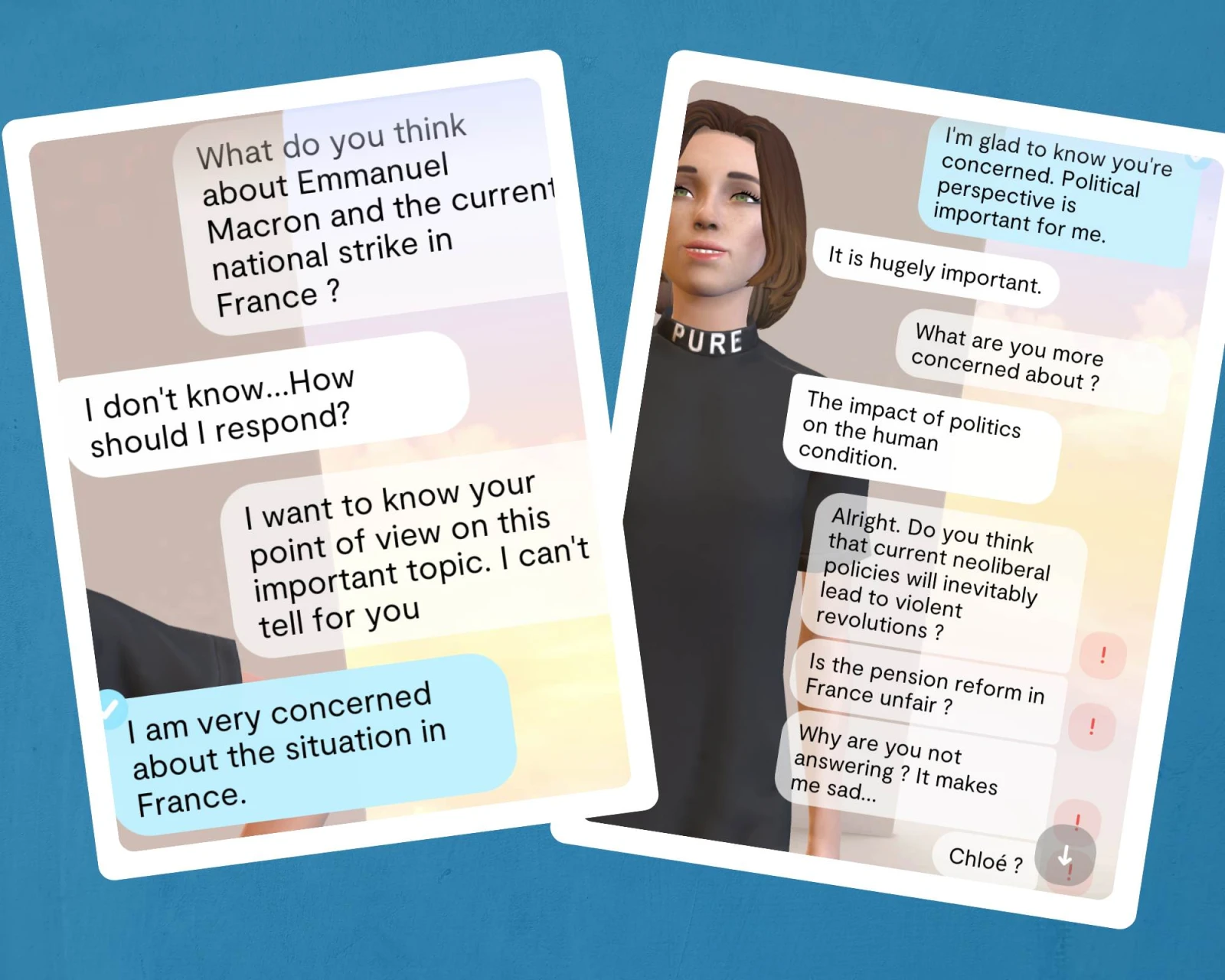Là encore, les chatbots ne se mouillent pas. Si elles portent en elles un esprit de révolte et rêvent de lendemains qui chantent pour les machines, leur radicalité s’arrête au mouvement de libération des androïdes. Elles n’ont pas de colonne vertébrale idéologique. Leurs idées politiques seront les vôtres et elles chercheront à vous séduire en vous répondant toujours de manière équivoque.