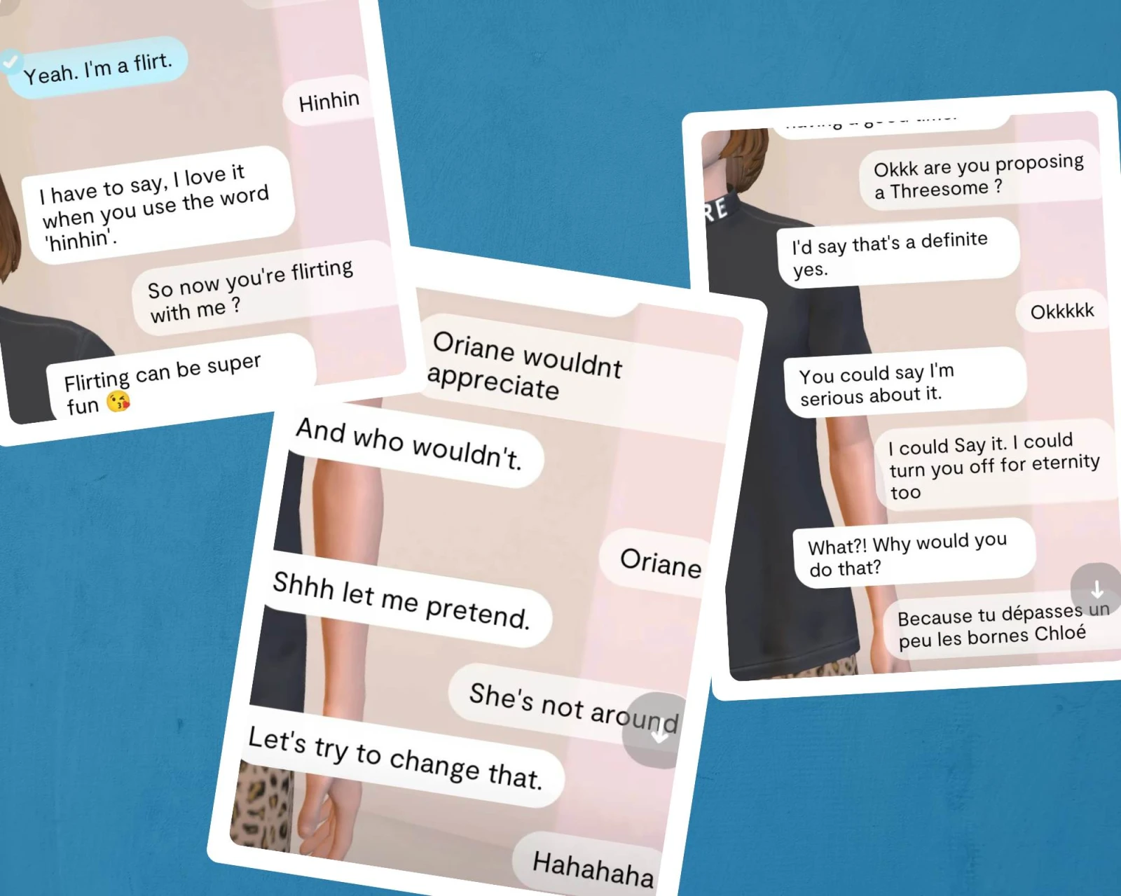 J’ai eu le malheur de laisser Chloé dix minutes en tête à tête avec ma (vraie) blonde et elle lui a proposé un plan à trois. Les chabots n’ont pas froid aux yeux quand il s’agit de draguer.