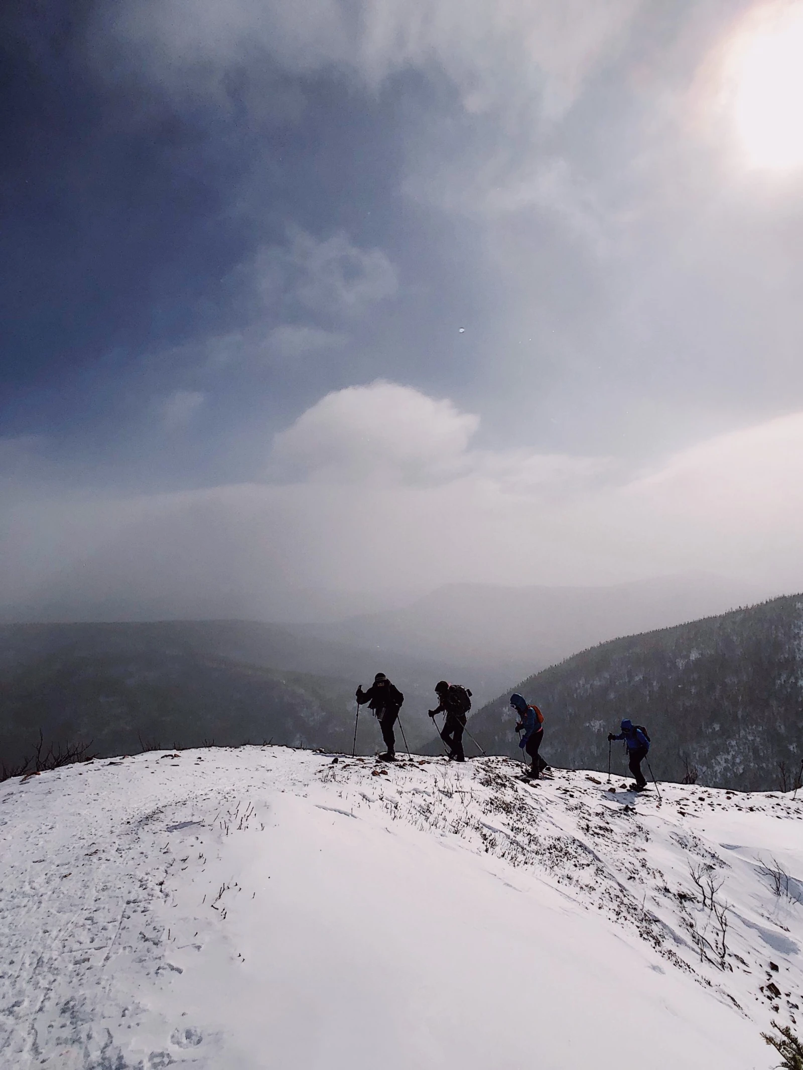 Dans les Chic-Chocs, on m’avait prévenue de ne pas manquer le sentier de la crête du mont Vallières-de-Saint-Réal, une splendeur. Au jour J, j’ai donc troqué mes skis pour des raquettes et je suis partie, avec cette petite brise qui s’annonçait délicieuse. Monte, monte, monte, pause. Monte encore, prend une bouchée de barre Clif froide. Monte, enlève un morceau parce que le multicouche est un art que je ne maîtrise pas encore à la perfection. Monte et commence à trouver que les bourrasques sont pas mal intenses.