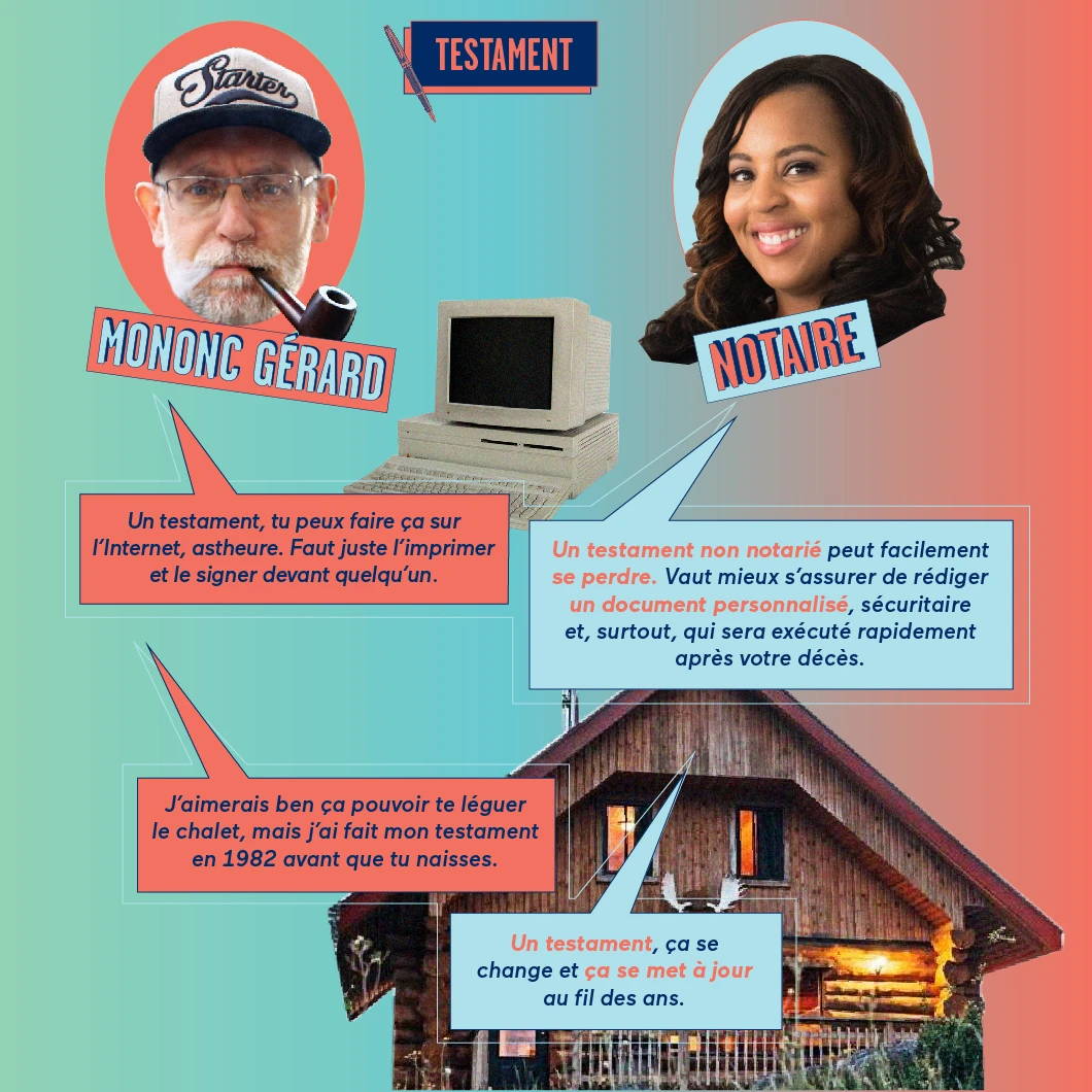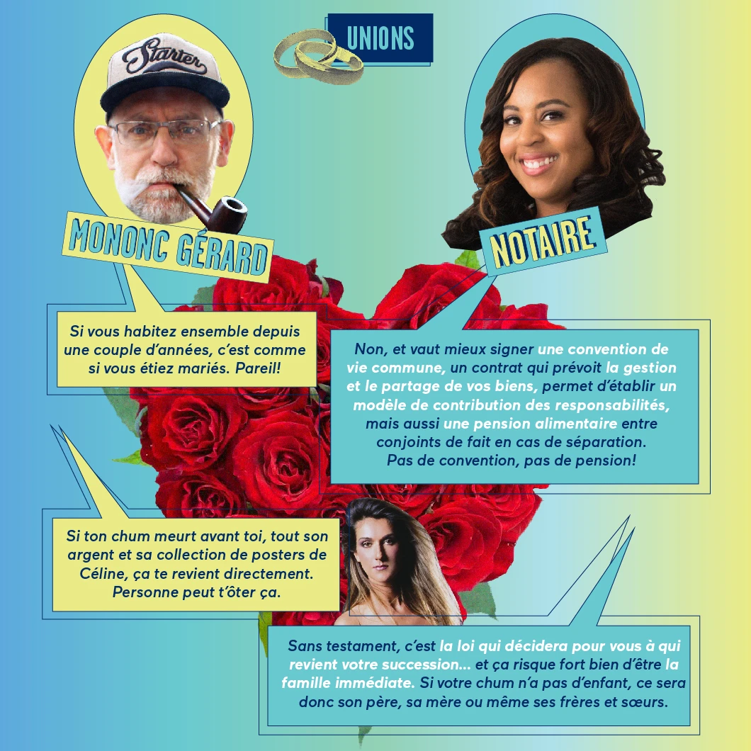 Pour prendre des décisions de vie importantes, vaut mieux s’en remettre à des professionnels, même si Mononc Gérard a toujours été ben smatt avec vous et qu’il a l’air d’en savoir pas mal. C’est quoi, vos droits, en tant que conjoints de fait? Comment on fait ça, un testament? Google, c’est tu une bonne référence pour tout ça? (Un indice : pas toujours.)