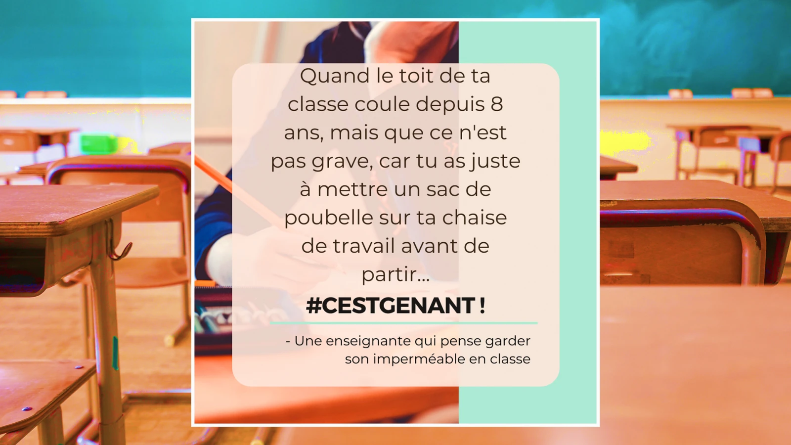 Les enseignants et les enseignantes qui le souhaitent peuvent nous écrire sur Messenger et en DM sur Instagram. Une fois que l’on reçoit les témoignages, on les trie et on les classe par thématique. On retrouve par exemple: le manque d’argent pour la classe (un des thèmes les plus abordés par les profs), l’insalubrité (la qualité de l’air, la moisissure, la vermine, etc.) ou les heures de travail non rémunérées. Ensuite on les révise, on les corrige et on les adapte pour que la structure des témoignages soit uniforme, sans pour autant en changer le sens. Ensuite, on les glisse dans un canevas et on les publie sur nos réseaux sociaux.