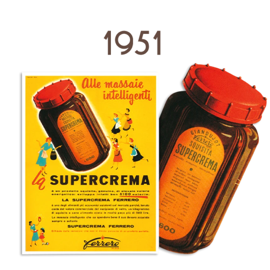 Cinq en plus tard, l’exquise pâte est transformée en un produit facile à étendre sur du pain, le Supercrema. Selon la légende, durant la canicule de 1949, les fameuses « briques de chocolats » ne parviennent pas à rester dures, même congelées. Les créateurs décident donc de le vendre tel quel dans des petits pots de verre fermés. Mais il s’agit vraiment d’un mythe, le site officiel de l’entreprise n’en fait pas mention.