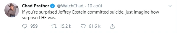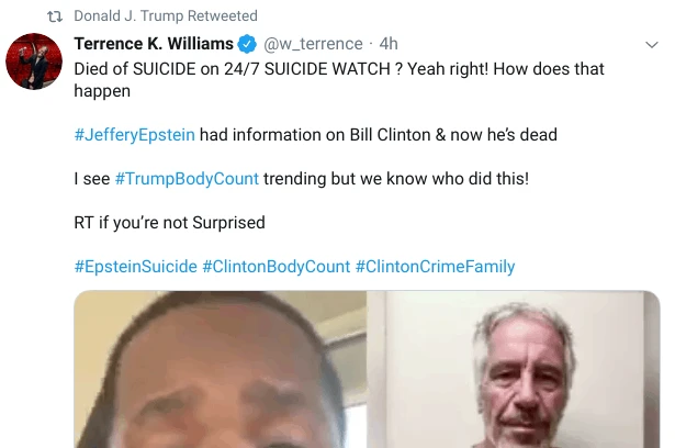 En effet, le président américain n’a pas pu s’empêcher de retweeter un internaute qui prétend que le suicide d’Epstein serait plutôt un complot de Bill Clinton qui l’aurait fait assassiner pour cacher son implication dans l’affaire.