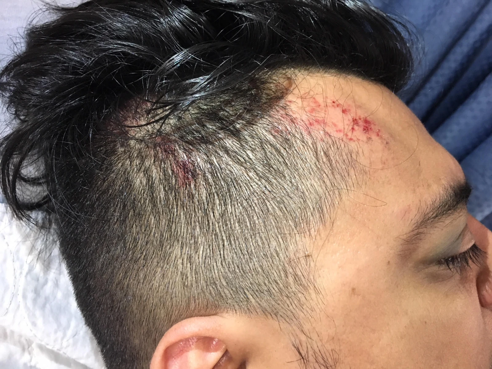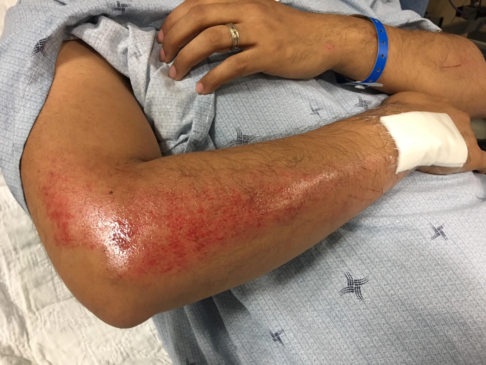 Arrivé à l’hôpital, je suis amené dans la salle de trauma où on me nettoie. Mon bras droit est tellement éraflé que le sang qui perle donne l’impression que rouge clair est ma vraie couleur de peau. Pendant qu’on désinfecte mon bras, on m’enlève mes vêtements. Un monsieur prend mon pénis dans ses mains et l’observe en m’informant que comme j’ai passé par-dessus mon guidon, j’aurais pu l’accrocher. Mais non, mon pénis est sain et sauf. Direction salle des scans.