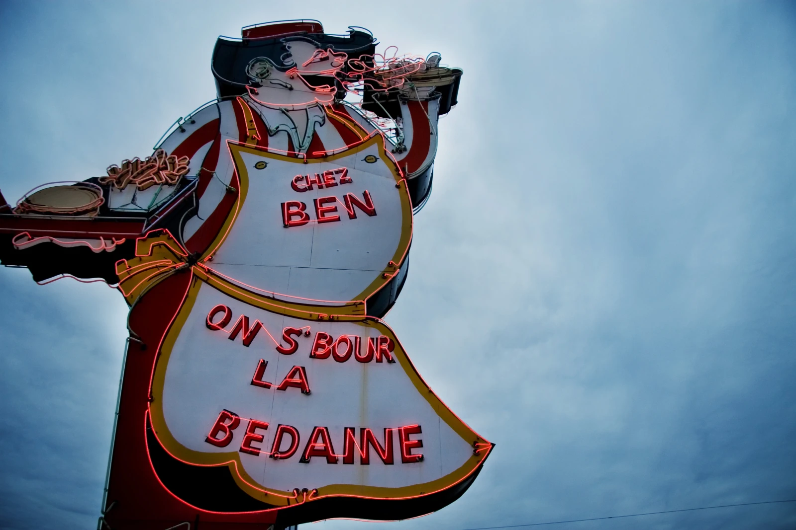 Granby est le paradis des motels avec des enseignes en néon des années ‘50. De toute beauté, vraiment. Parmi les plus «spectaculaires» : celle de Ben on s’bourre la bédaine, une cantine réputée estrialement pour sa poutine. C’est dans ce resto mythique que nous avons fait notre premier arrêt.