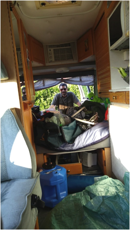 Je gagne donc la confiance de Roger. On arrive au terrain vague, sans chemin ni délimitation d’emplacements, qui fait office de «camping». La route a été longue, on fait une petite sieste qui se transforme en deux heures de ronflement et on se réveille entourés de pick ups et de roulottes VIDES. Tous les voisins sont partis pour la soirée, nous bloquant le chemin. Il est impossible de sortir du »terrain vague qui fait office de camping¢. Le genre de situation où une crise d’appendicite a le temps de se transformer en péritonite, en route vers une douce muerte. Par chance, nos organes ont joué les fins collaborateurs.
