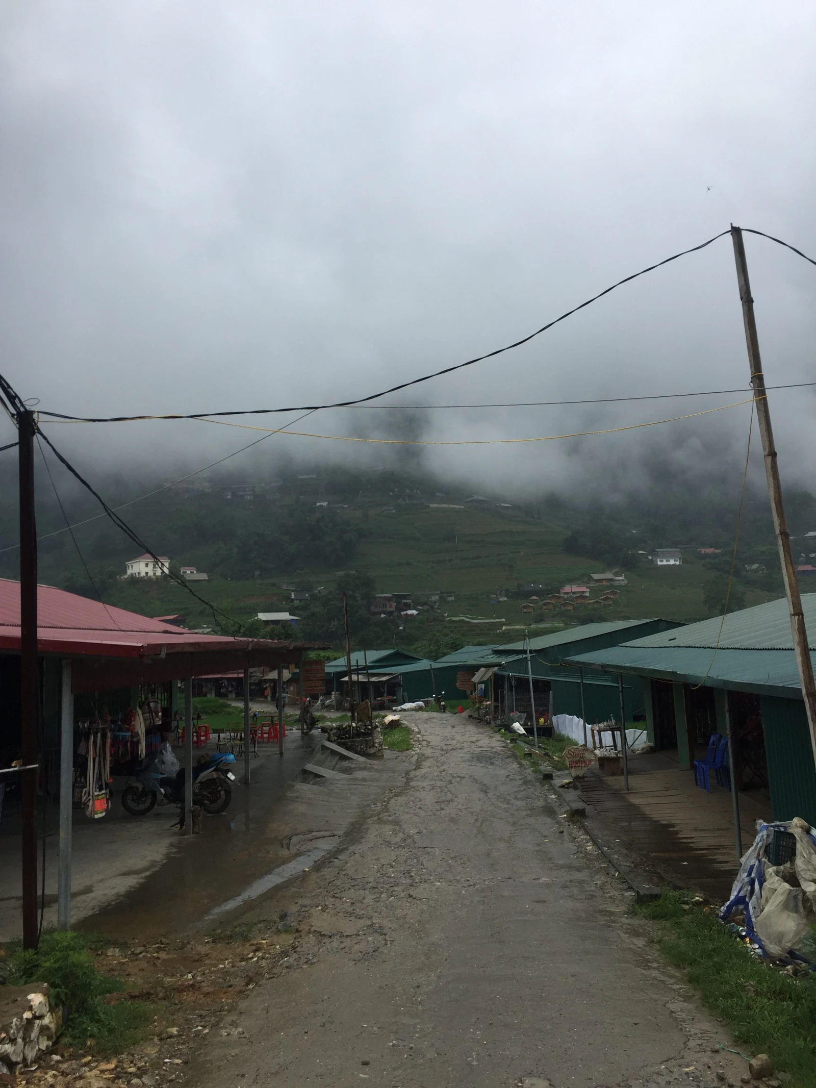 Plus tard dans l’après-midi, on finit par prendre un break. Il y a tellement de brouillard qu’on ne voit rien à plus de 10 mètres. Thư nous sert un thé, qui goûte le gazon, pour vrai. On comprend qu’on est en fait arrivés chez elle. Les quelques heures qui suivront furent assez sur réalistes. On est restés assis 3 h je pense, a perdre toute notion de temps où d’espace, complètement hypnotisés par notre environnement dont on prend conscience au fur et à mesure que le brouillard se dissipe. 4 petites filles âgées de 3 à 12 ans, occupées à broder. 2 petits garçons qui jouent. L’un avec une planche à roulettes complètement homemade qui se lance dans la pente à toute vitesse, l’autre qui court, une machette à la main après un poulet. Pis des chiens pas mal gossants, qui font que s’chicaner et m’font sauter de ma chaise 1 ou 2 fois.