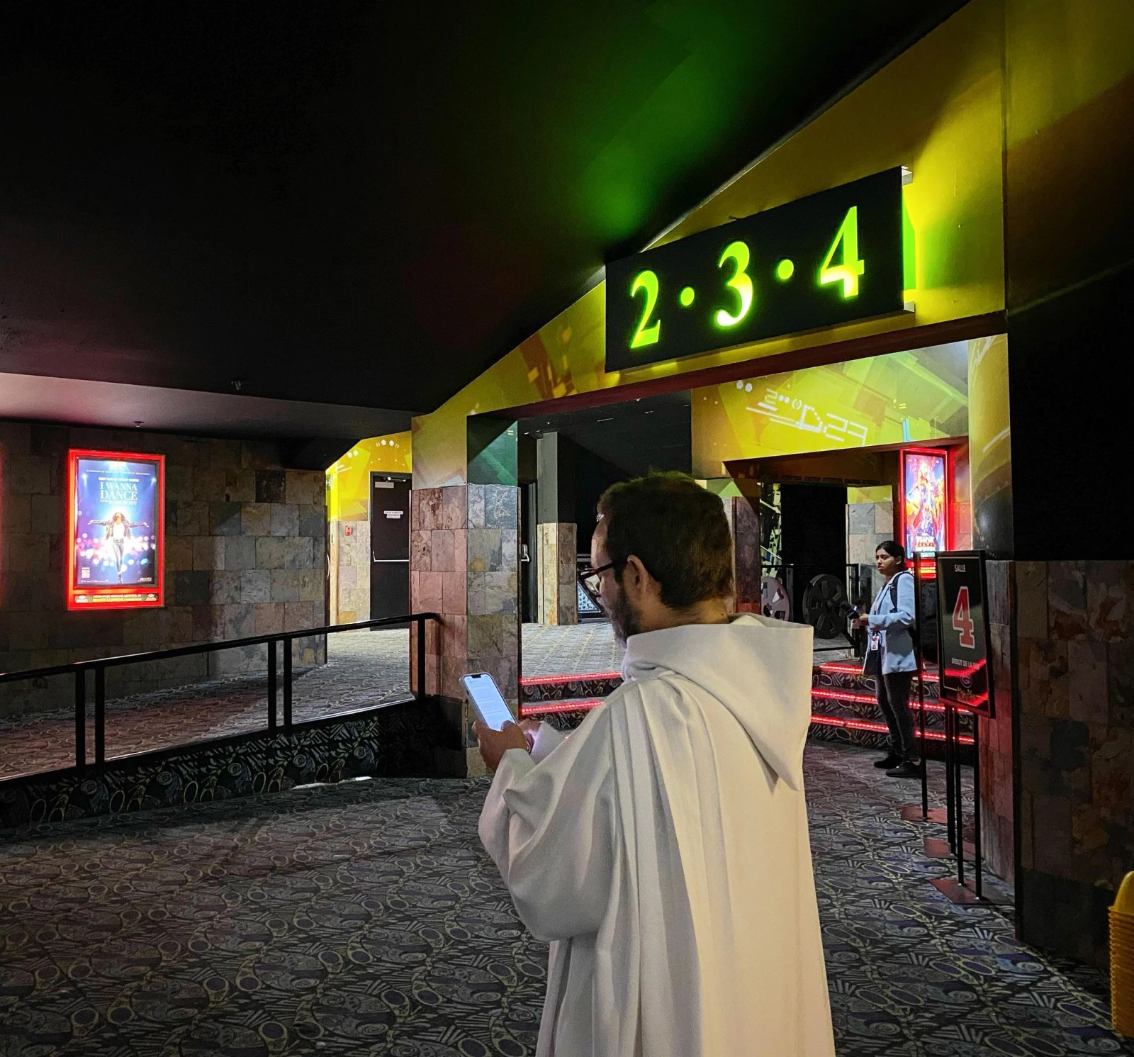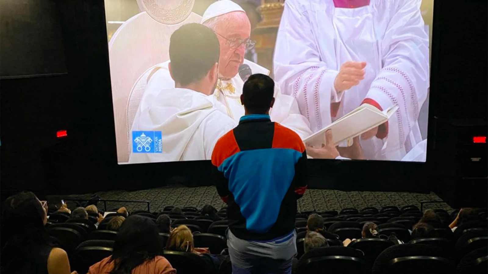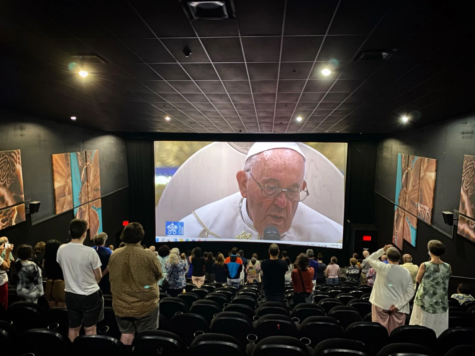 Vêtu d’une chasuble, Fabrice pianote sur son cellulaire en face de la salle de cinéma. L’homme d’Église en plein cheminement diaconal endosse à 100% la mission de réconciliation du pape avec les Premières Nations. « La première étape d’une réconciliation est de reconnaître ses erreurs », admet Fabrice, qui salue aussi l’idée de permettre à des gens d’assister à la grande messe dans une salle de cinéma. « C’est pas si bizarre. Le pape nous demande d’être dans le monde et de faire partie d’une seule et même nation », souligne l’aspirant diacre, avant de se replonger sur son cell.