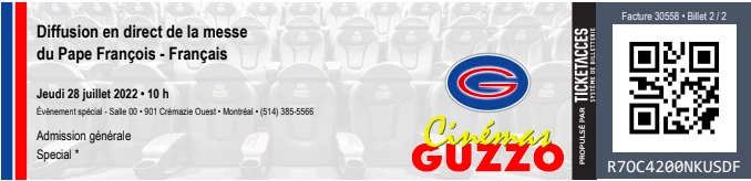 « Les dix complexes de Cinémas Guzzo du Grand Montréal diffuseront le grand rassemblement et la messe du pape François prévus le 28 juillet, à 10h, à la basilique Saint-Anne-de-Beaupré, près de Québec. »