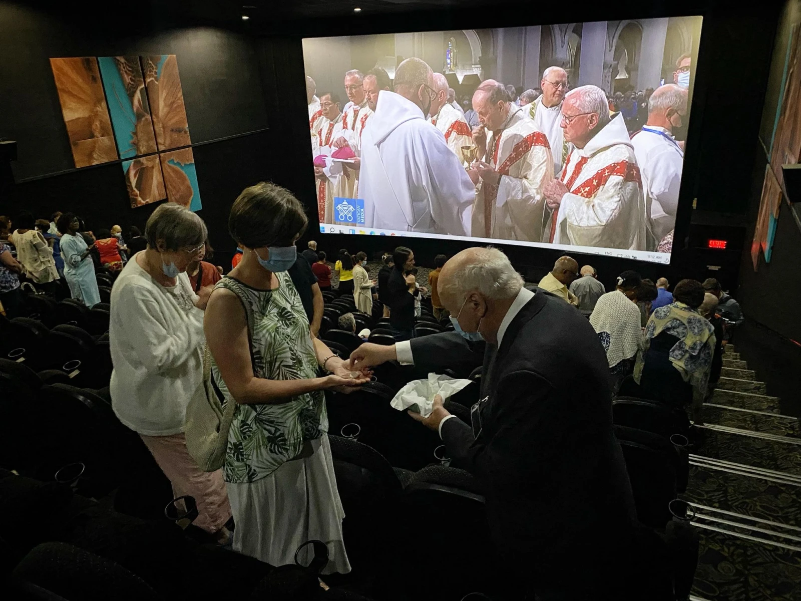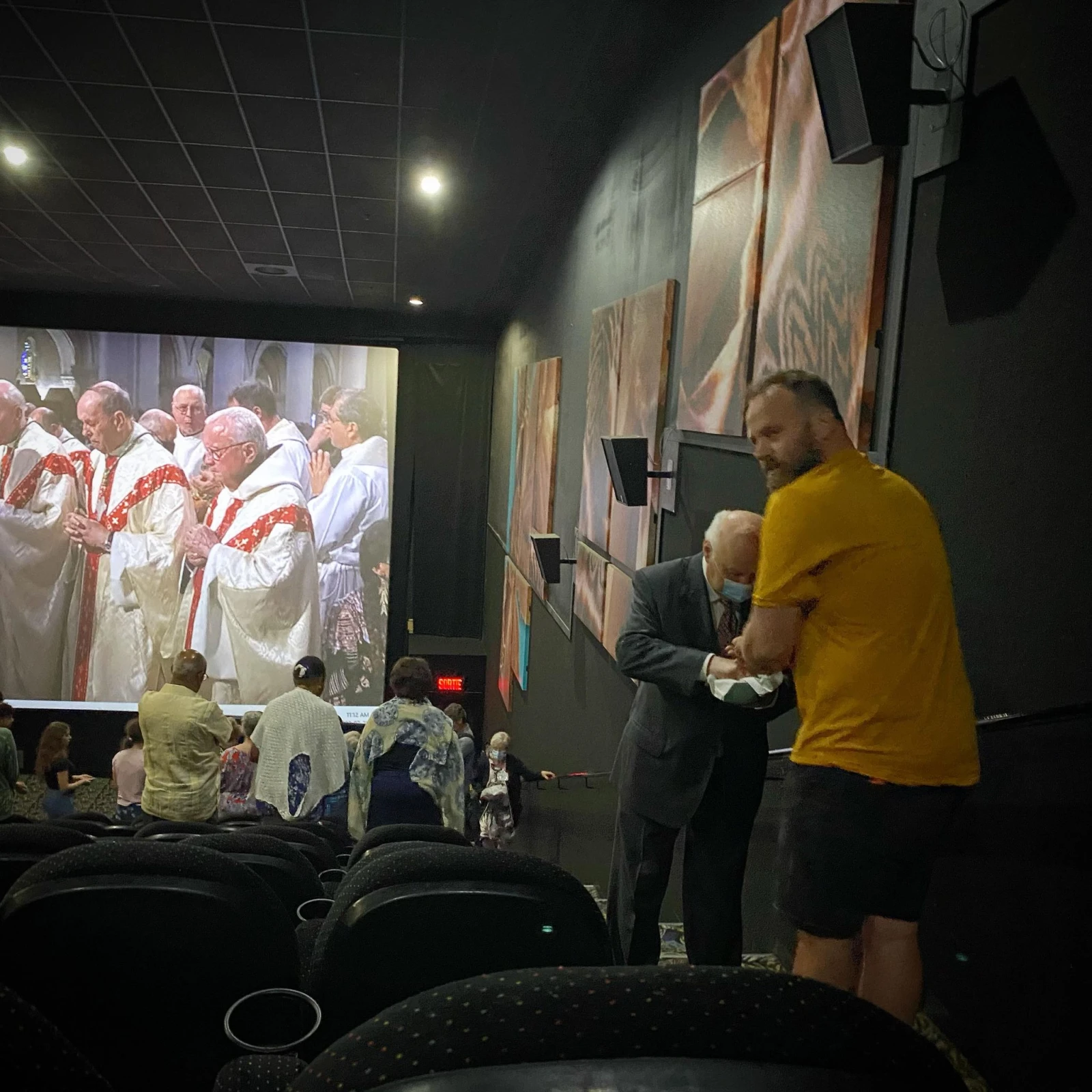 La cérémonie sur l’air de «Il est grand le mystère de la foi», pendant que les spectateurs se donnent la paix du seigneur dans les rangées du cinéma.