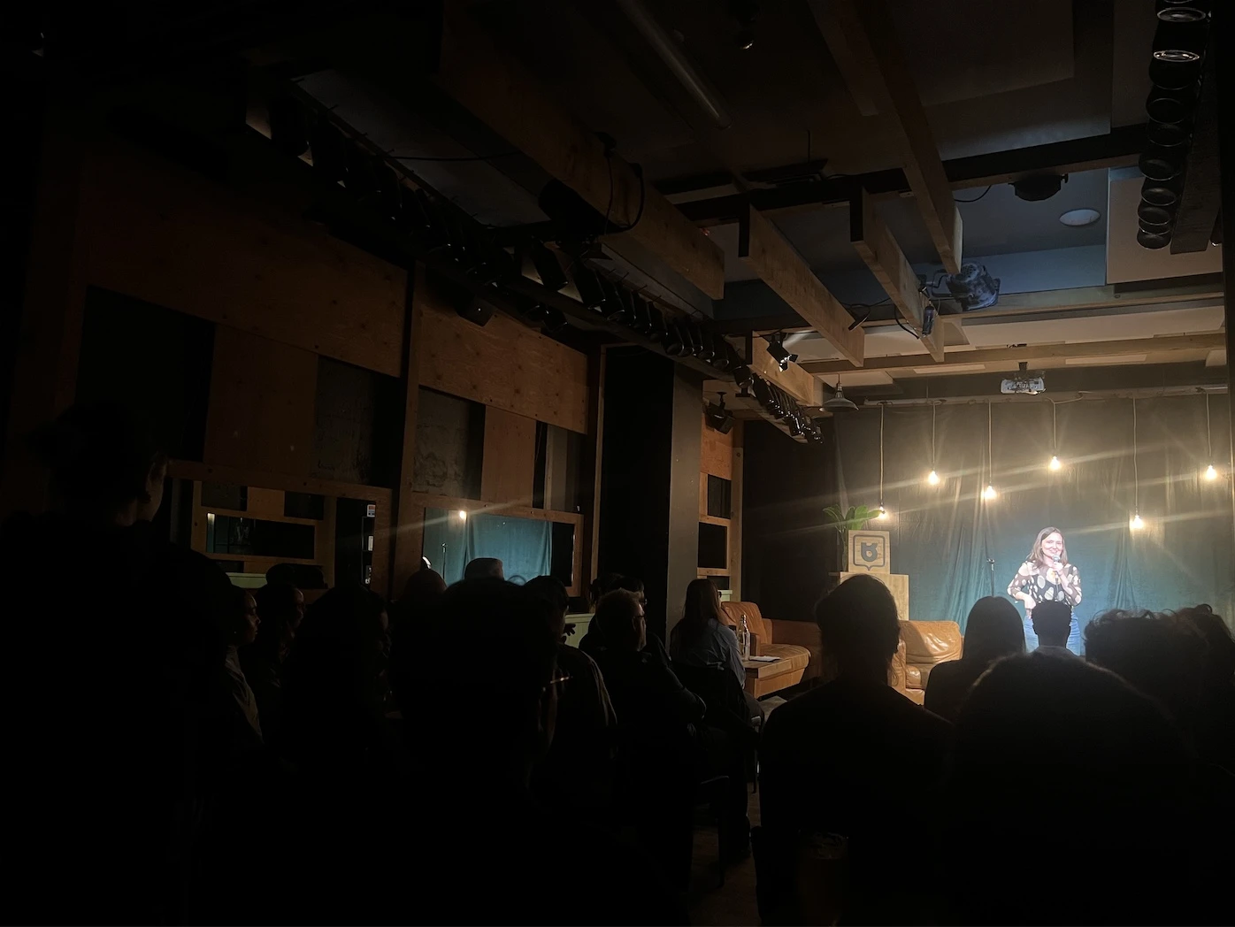 Pendant que les humoristes installent leurs trépieds, l’hôtesse m’offre une table au premier rang, juste devant la scène. Je décline poliment. Un jeune couple en héritera et deviendra la cible récurrente des blagues d’ouverture, de milieu, de fin. Bref, tous les humoristes s’en délecteront.