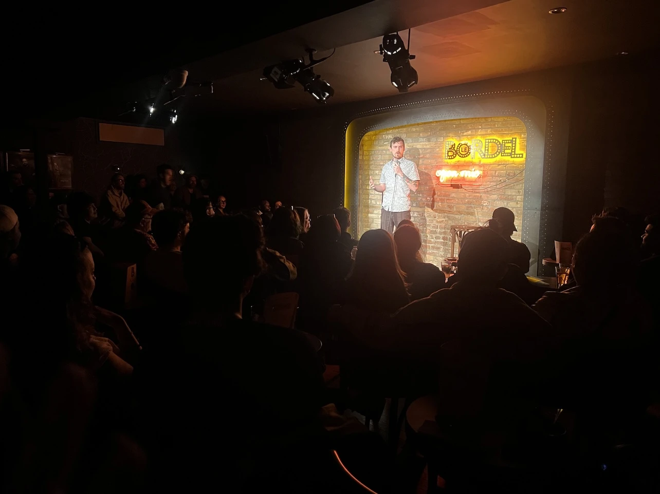 Open mic au Bordel, rue Ontario, dans ce qui est sans doute la salle de comédie la plus prisée au Québec. Les chaises encore tièdes de la première partie, un énième pacing de la relève, se vident à peine que déjà le public afflue pour la seconde ronde. Douze humoristes, de l’apprenti aux vétérans un peu cabossés, viendront tour à tour tester leur matériel.