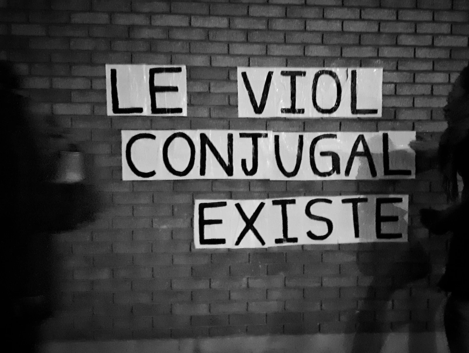 En moins d’une minute, les lettres sont assemblées. « Le viol conjugal existe », lisent les passants qui jettent quelques regards sans rien dire.