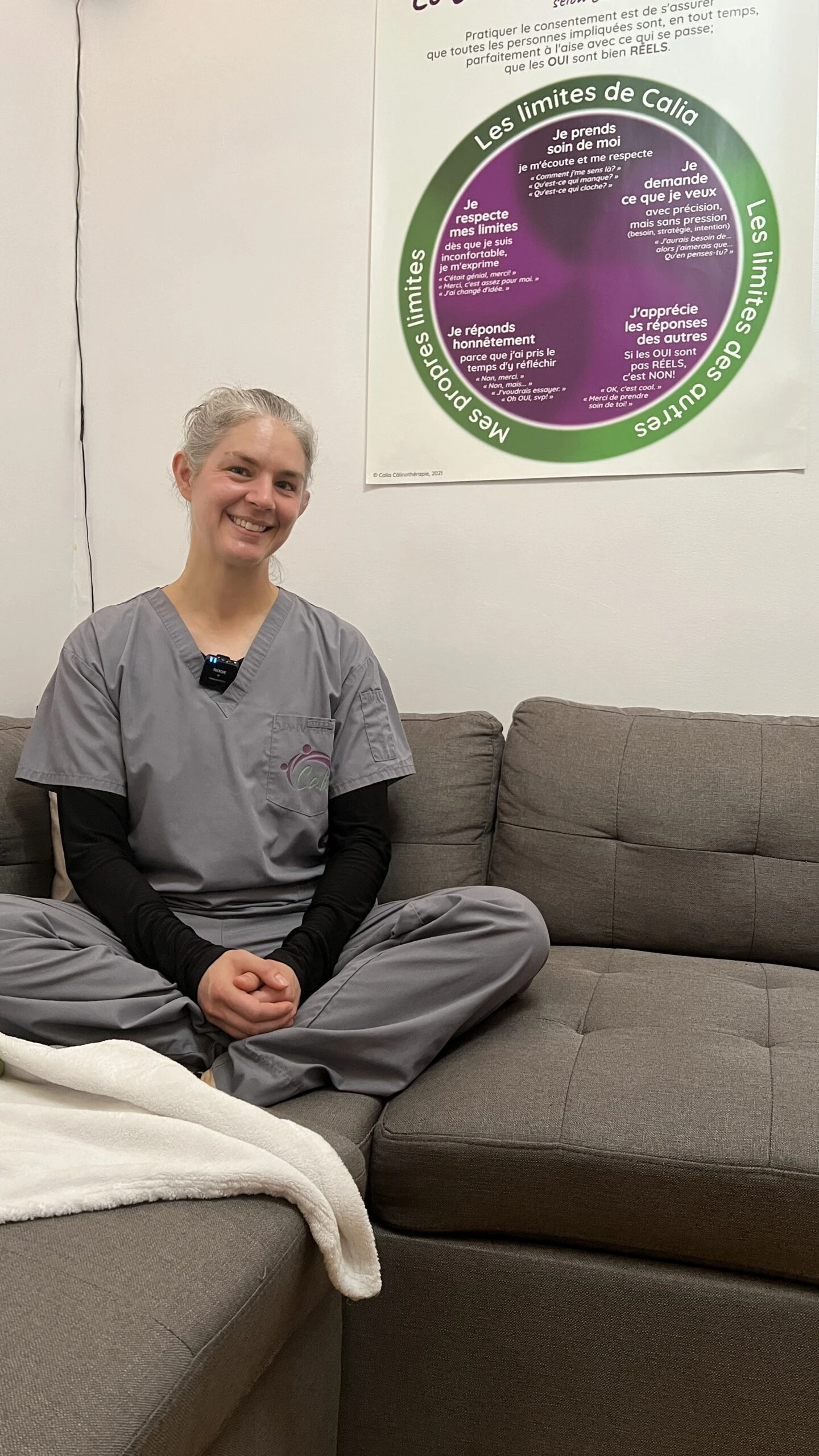 On s’assoit une en face de l’autre sur le divan. D’entrée de jeu, elle m’explique : « On n’a pas droit d’utiliser le terme “câlinothérapeute”, car le terme “thérapeute” est protégé. Par contre, on peut utiliser “la câlinothérapie”. Il faut juste que tu précises que ce service ne peut pas remplacer un médecin, par exemple. Je ne peux pas te garantir quoique ce soit avec mes services. »