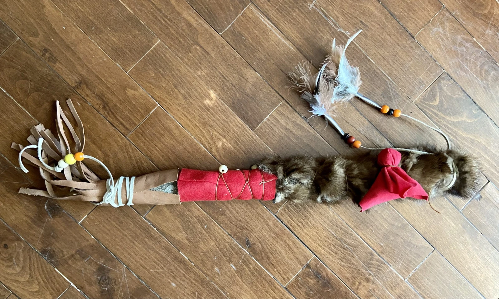 Alors que nous assemblons les différents matériaux, la guide nous explique que chaque élément a une signification bien précise : la fourrure permet de parler avec pouvoir et force, les pierres aux quatre couleurs des éléments représentent les forces de l’univers tandis que les plumes illustrent le courage et la sagesse. Ça peut toujours servir!