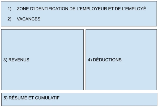 Voici donc en gros un talon de paie virtuel, divisé en sections pour votre compréhension (un gros merci au graphiste qui a réussi à transformer mon gribouillis informe sur Paint en œuvre d’art):