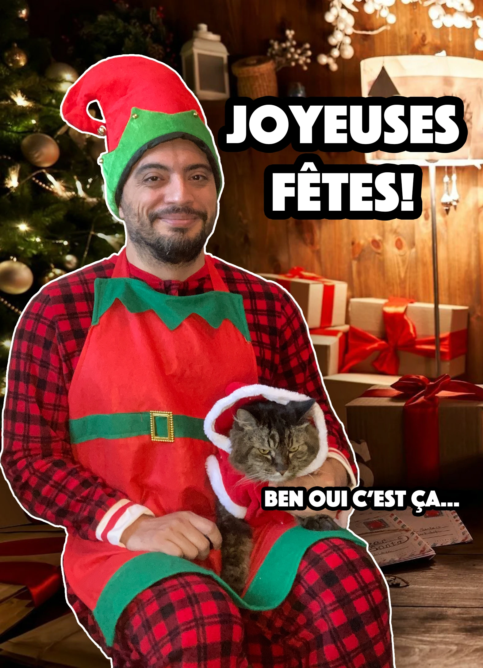 Il me fallait donc une photo. Sur le coup, je me suis dit que comme je m’adresse à mes abonnés, ils sont habitués de voir mon chat. Il pogne toujours plus que moi, le petit maudit. Je suis donc partie à la recherche d’un onesie pour adulte pour moi et de costumes pour le chat que j’avais vu au Dollorama.