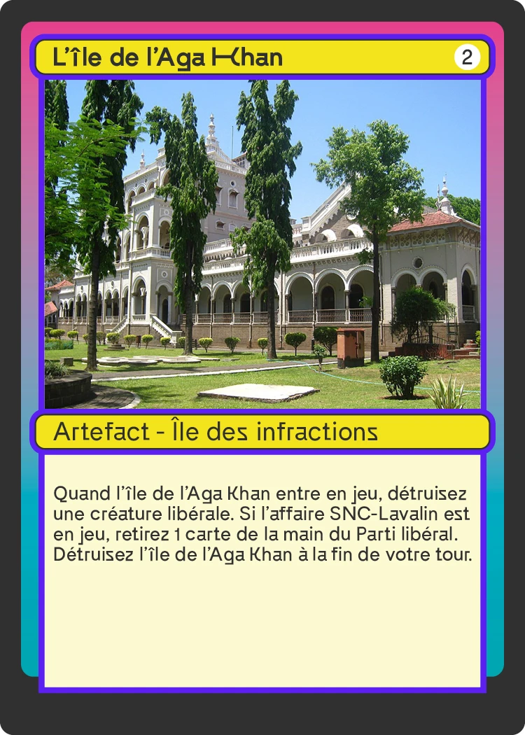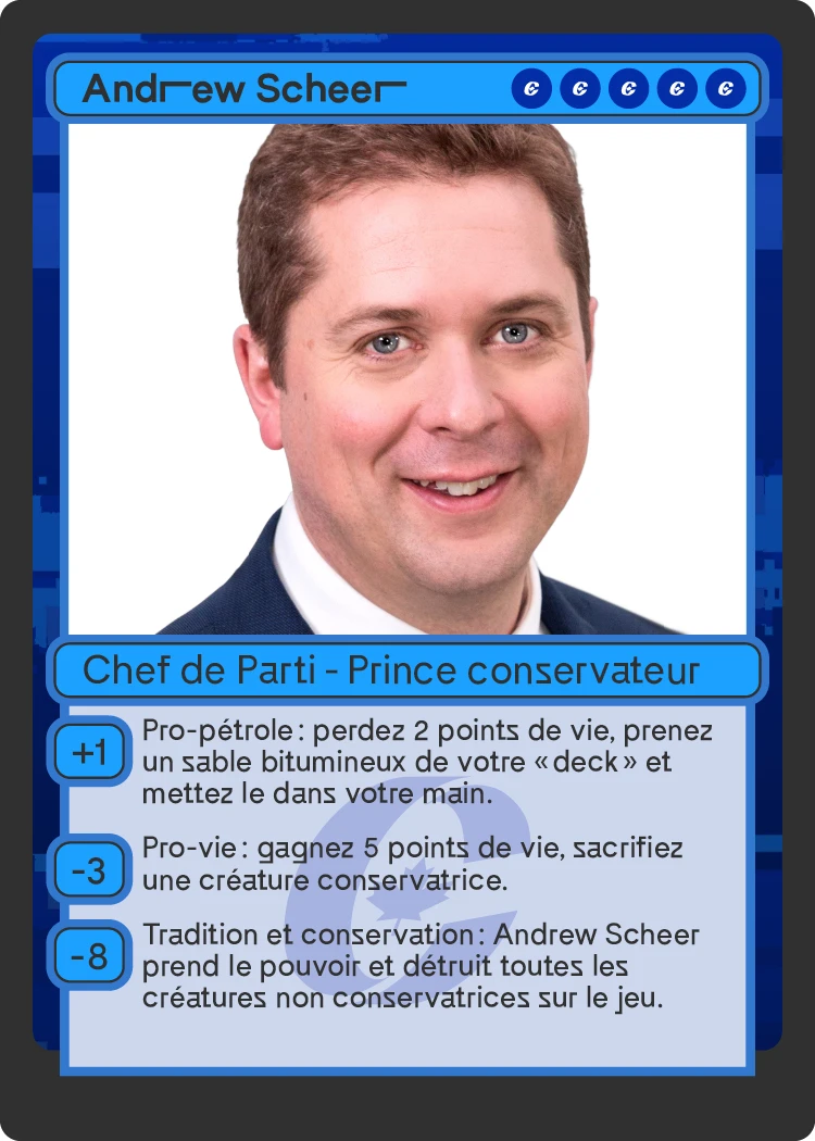 Vous trouverez trois bibliothèques de cartes (appelées communément « deck ») représentant les grands partis : Libéral, Conservateur, Néo-Démocrate. S’ajoute un quatrième deck que nous avons appelé « Petits partis » regroupant essentiellement le Parti Vert, le Bloc québécois et le Parti populaire du Canada. Les decks seront dévoilés les uns après les autres, en commençant par celui du Clan libéral, que vous pouvez télécharger dès maintenant.