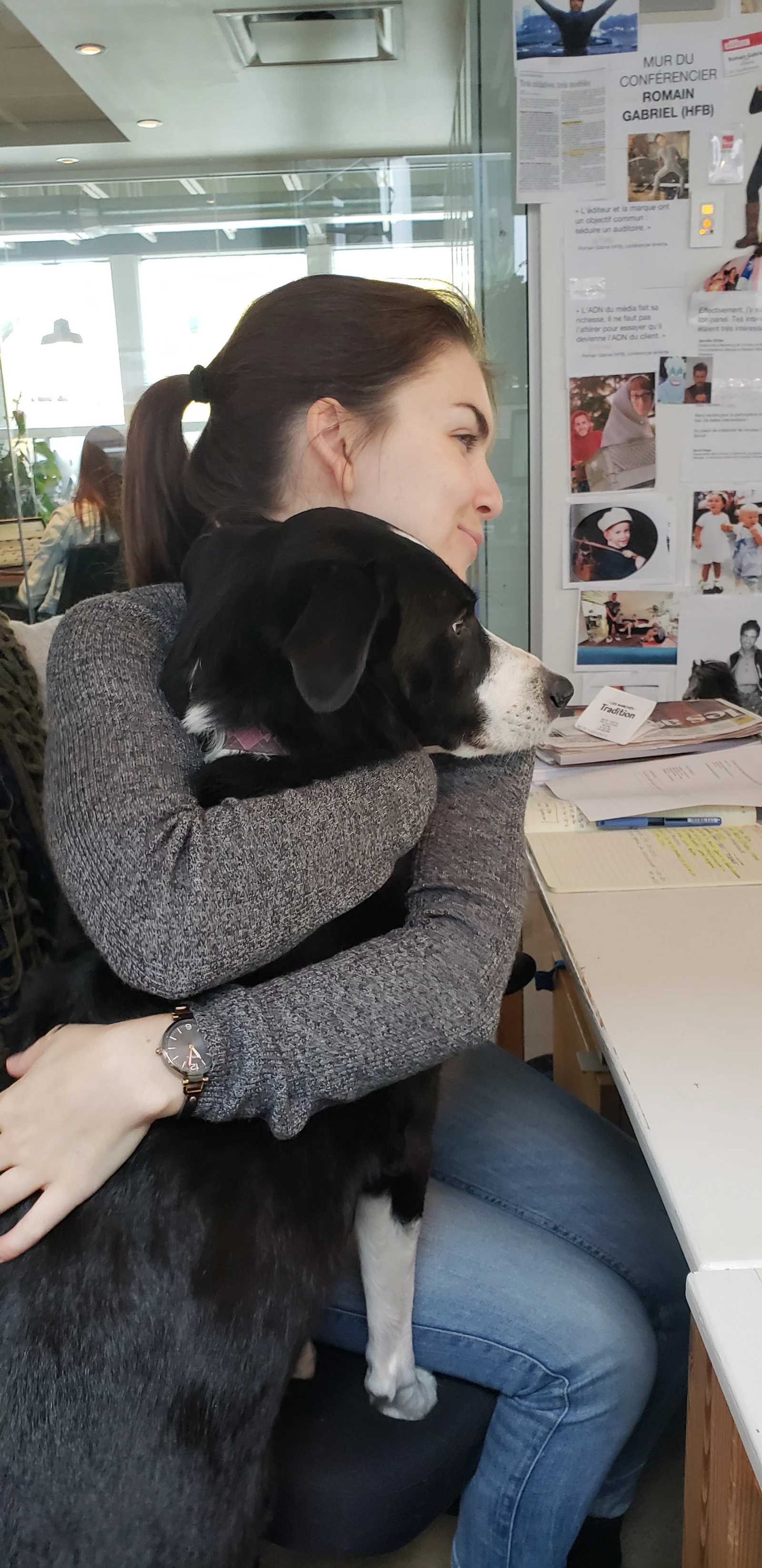 Peu à peu, je me suis totalement intégrée à mon environnement de travail et les chiens présents au bureau ont permis d’outrepasser mes barrières psychologiques. Une étude de l’International Journal of Environnemental Research and Public Health explique que les pitous changent complètement la dynamique de bureau.