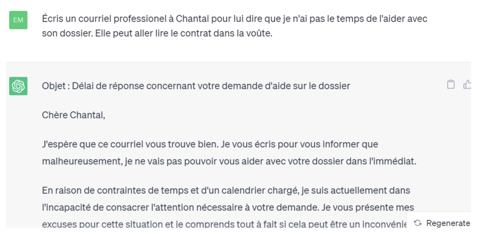 On est en 2023 et quitte à nous voler nos jobs dans un futur proche, les nouvelles technologies n’ont qu’à commencer à faire le sale boulot pour nous tout de suite. ChatGPT est loin d’écrire du Victor Hugo, mais il peut donner des petits coups de main, lorsqu’il s’agit de dire à Chantal qu’elle est ben fine, mais que vous n’avez pas le temps de faire son travail à sa place, par exemple.
