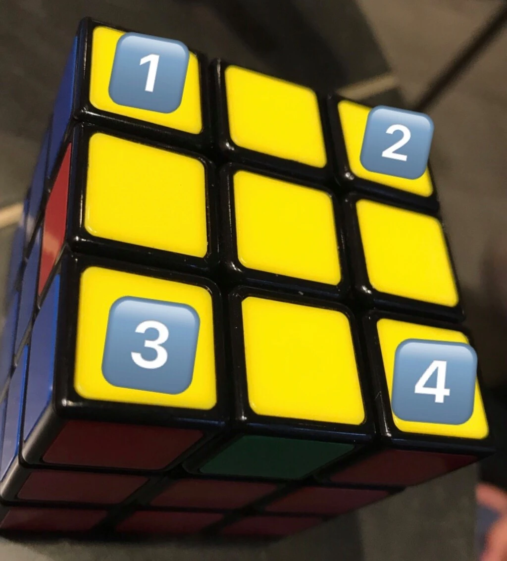 Sinon, placez les deux coins à la bonne place en position 1 et 2, 1 et 4 ou 2 et 3. Faites ensuite R’, F, R’, B, B, R, F, R’, B, B, R, R, U’.