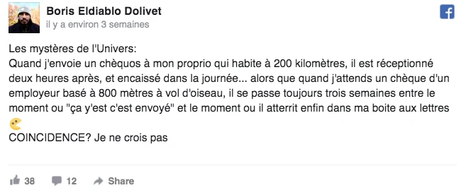 La fameuse phrase « le chèque est dans la poste » alors qu’il n’y est pas est aussi monnaie courante.