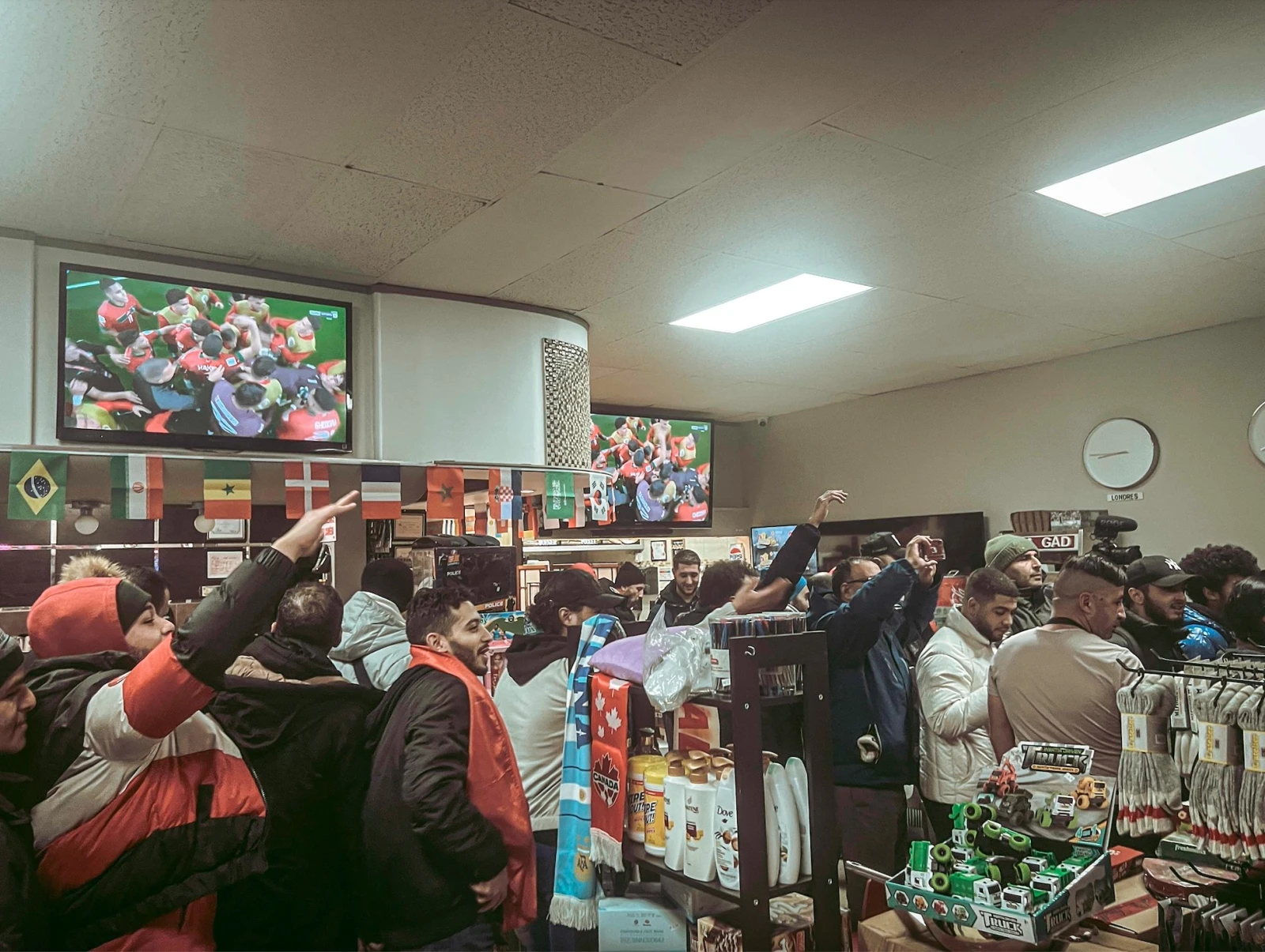 Si quelques rares femmes semblent accompagner leurs conjoints dans ce souk diasporique où l’on s’échange accolades, poignées de main et sucre de table en table, l’endroit est surtout occupé par un contingent d’hommes de tous âges, les plus jeunes arrivant fièrement le drapeau noué au cou. Malgré l’effervescence d’avant-match, point de musique outre celle du téléviseur commenté en langue arabe et le murmure du stress ambiant.