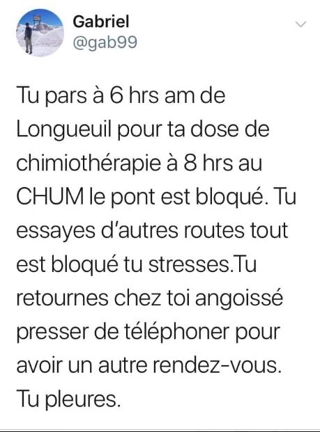 Un certain Gabriel a même écrit sur Twitter: « Tu pars à 6 h de Longueuil pour ta dose de chimiothérapie à 8 h au CHUM; le pont est bloqué. Tu essayes d’autres routes tout est bloqué; tu stresses. Tu retournes chez toi angoissé, pressé de téléphoner pour avoir un autre rendez-vous. Tu pleures. »