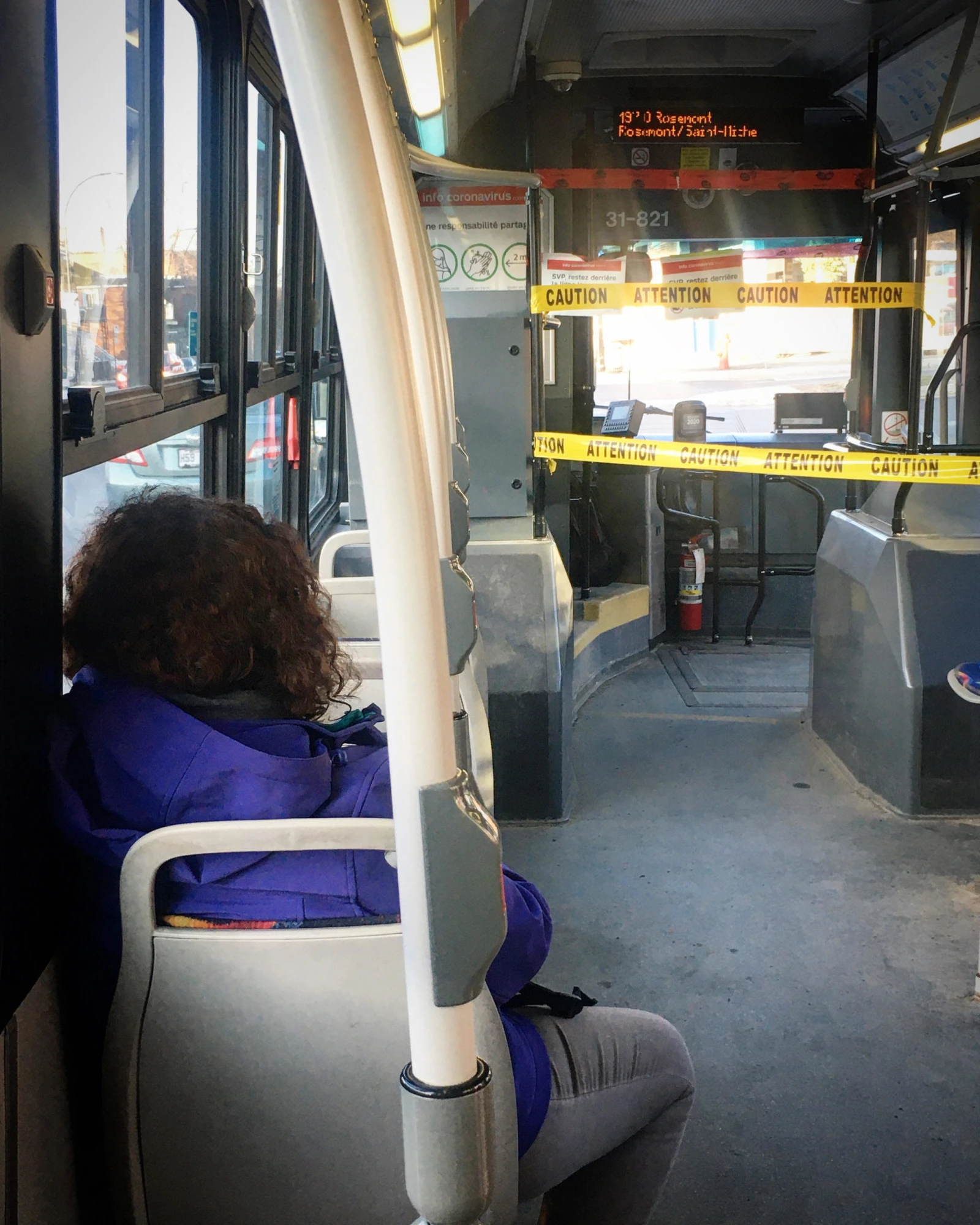 Pour prendre le pouls de la situation, je grimpe d’abord dans l’autobus 197 à l’angle de ma rue et du boulevard Rosemont. L’autobus est pratiquement désert un peu avant 7h. Des rubans jaunes séparent la portion avant du véhicule, empêchant l’accès au chauffeur. C’est voulu. Impossible d’embarquer à l’avant ou de payer en espèces, l’entrée se fait à l’arrière et les titres de transport ne sont pas validés à bord, bien qu’ils demeurent obligatoires.