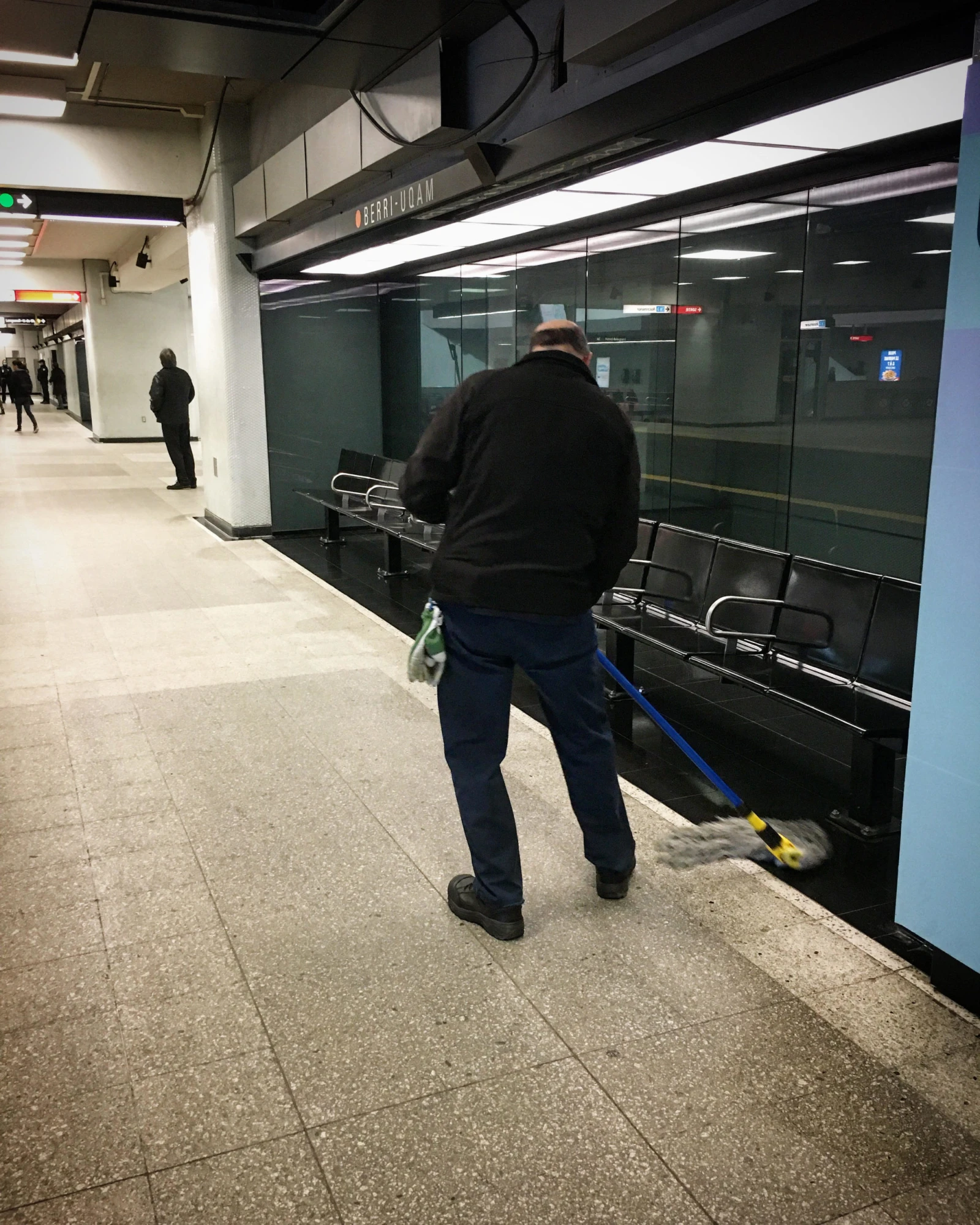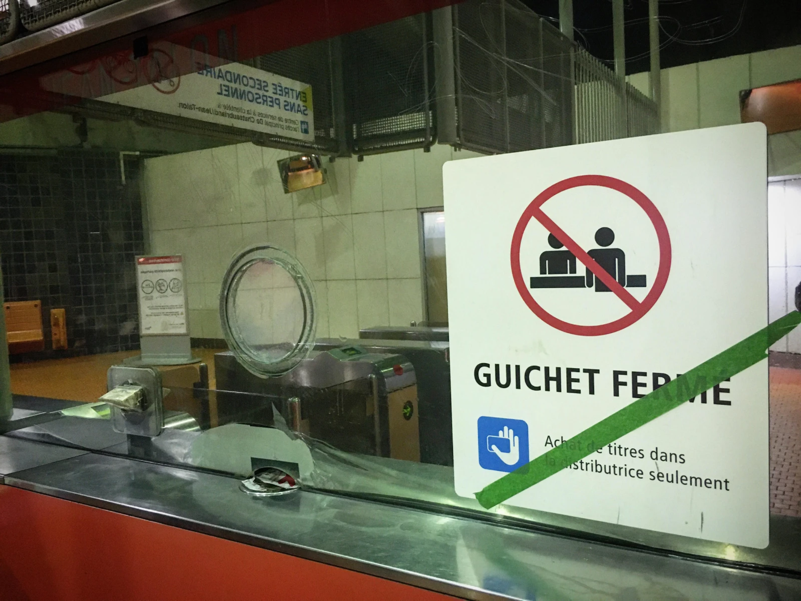 Au métro Rosemont, une affiche sur le poste du changeur nous oriente vers les distributrices de billets. Après avoir acheté une passe de jour, j’applique une couche de Purell que j’ai trainé avec moi. Le syndicat réclame depuis le début du désinfectant pour les mains accessibles à tous dans les installations.