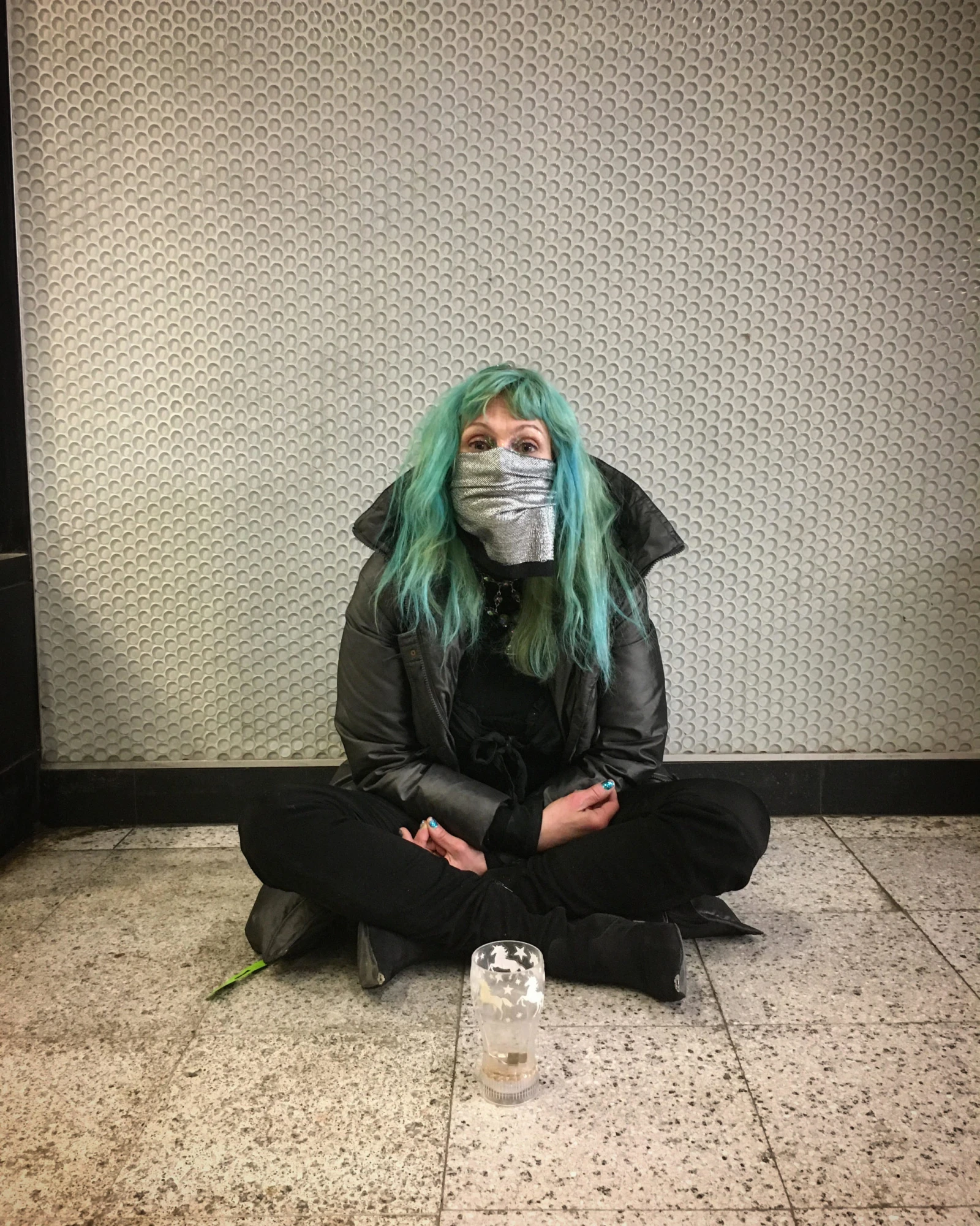Dans le couloir avant de sortir, Caroline quête depuis quelques minutes à peine. « Je veux juste 5$ pour m’acheter une tisane. Je fais un régime d’infusions de dix jours pour perdre du poids, mais aussi développer des anticorps contre le virus », explique-t-elle, en exhibant son nouveau foulard.