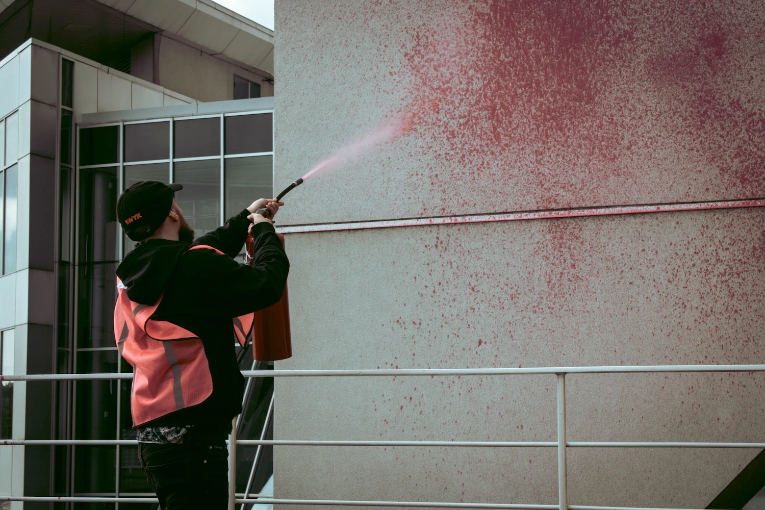 Tour à tour, ils sortent leur extincteur rouge rempli de peinture lavable et « décorent » la devanture du casino de leur emblématique couleur rose.