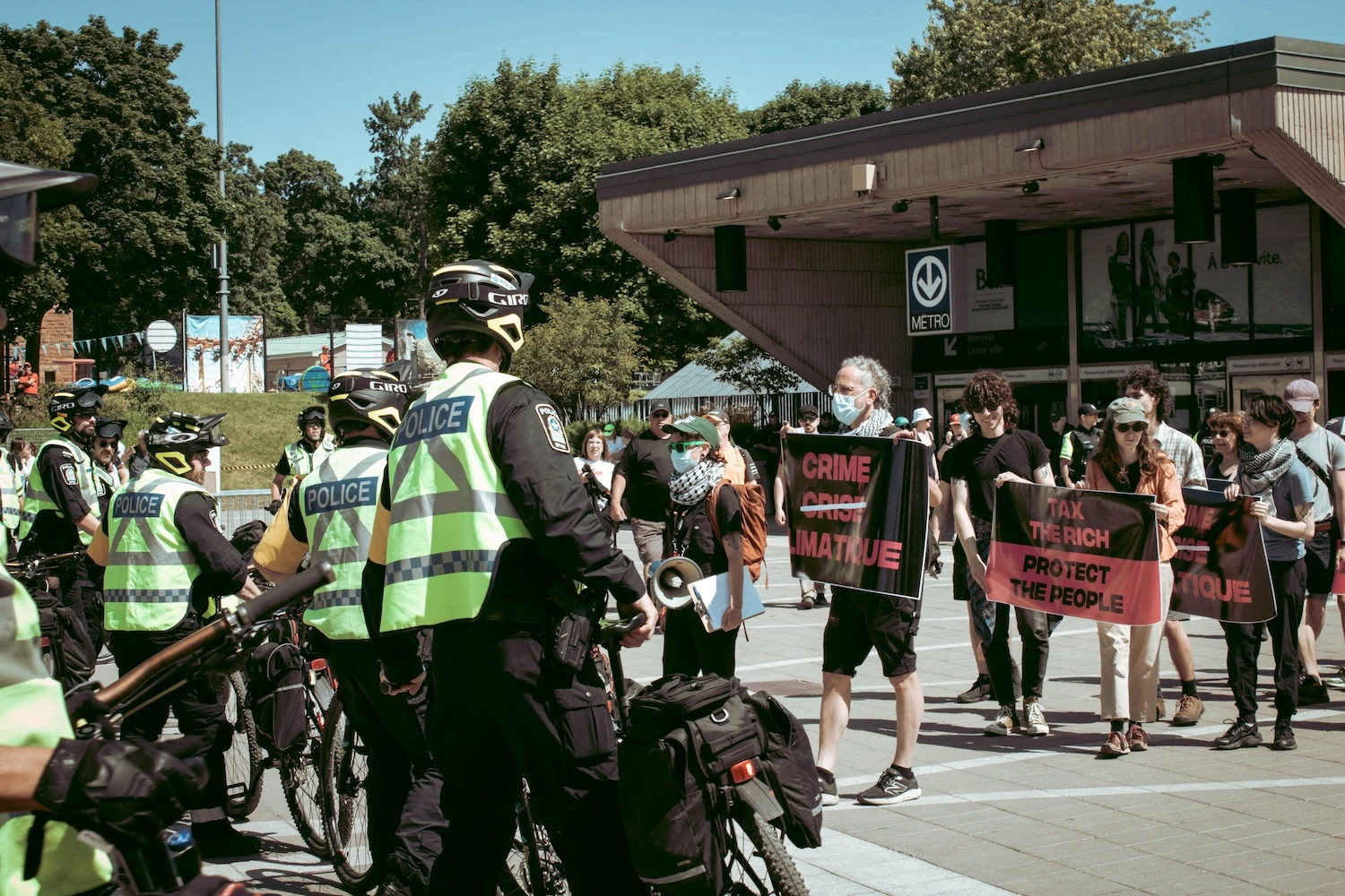 Le soleil tape sur les épaules des dizaines de milliers de personnes qui se sont déplacées vers l’Île Saint-Hélène pour assister au Grand Prix. Alors qu’une horde d’adeptes de courses automobiles sort de la station de métro Jean-Drapeau, un petit groupe de militants du collectif entame une manifestation, sous le regard de nombreux policiers.