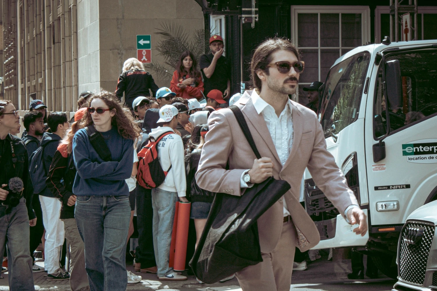 Pendant ce temps, Marc Bolduc, vêtu d’un complet rose, tente de se frayer un chemin vers l’entrée de l’hôtel. C’est là qu’il prévoit mener son action.
