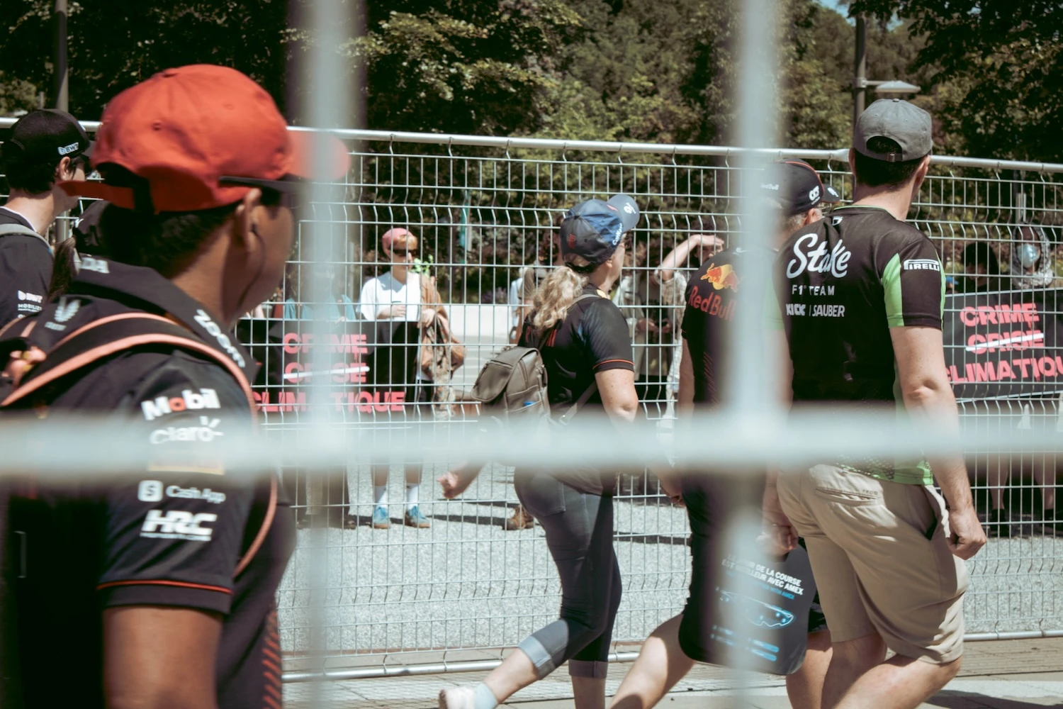 Pendant qu’ils scandent des slogans comme « Tout le monde déteste la F1 » et « La F1 au service des riches et des sexistes », des gens autour leur crient en retour : « Go home! ».