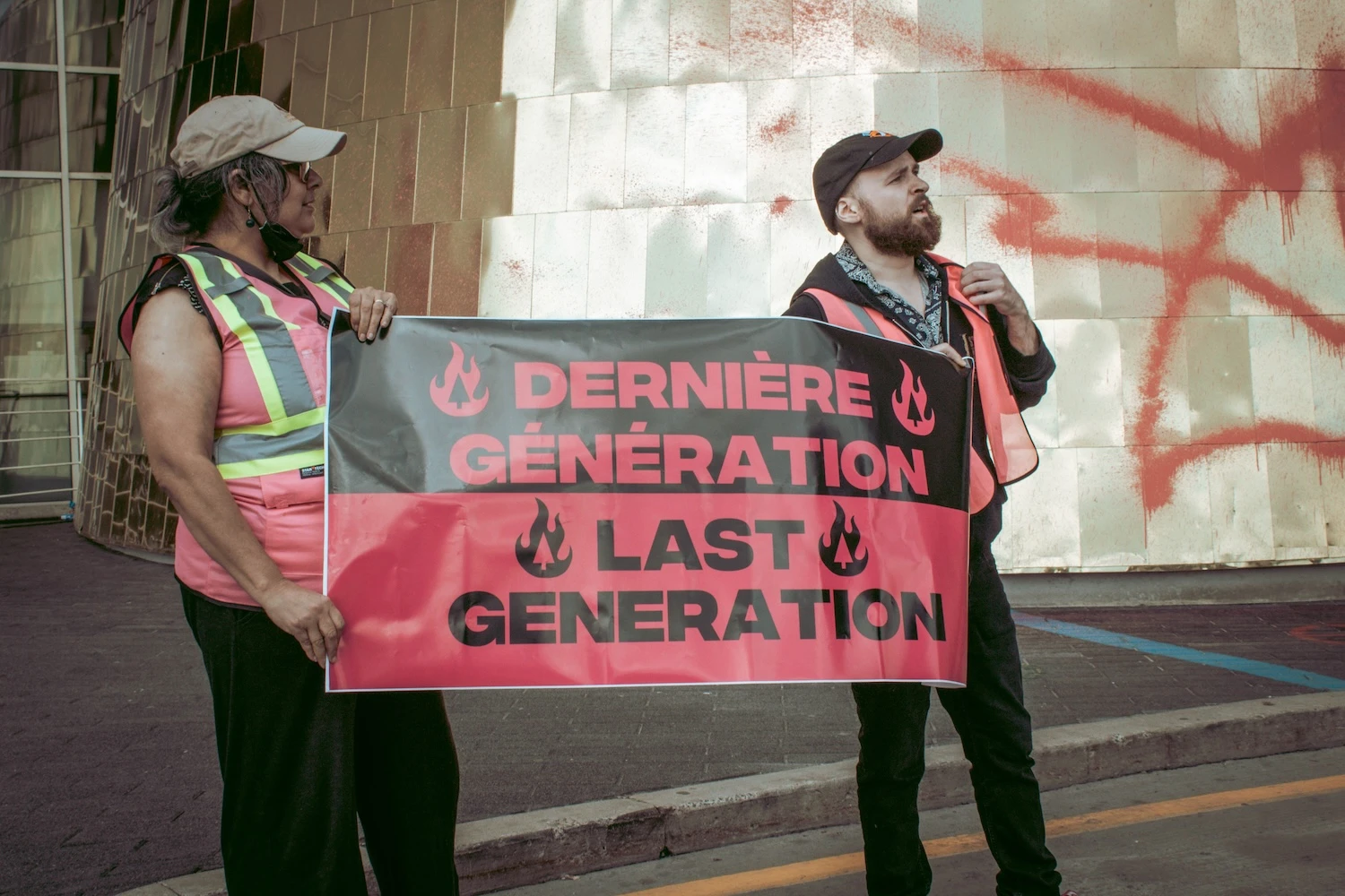 Un taxi arrive. Eulalie Reesink, une jeune militante de Dernière Génération Canada, en descend. Elle est là pour filmer la scène. Dans les deux dernières semaines, le collectif dont elle fait partie a aspergé de peinture rose lavable la Banque de Montréal et bloqué la circulation sur la rue Saint-Denis.